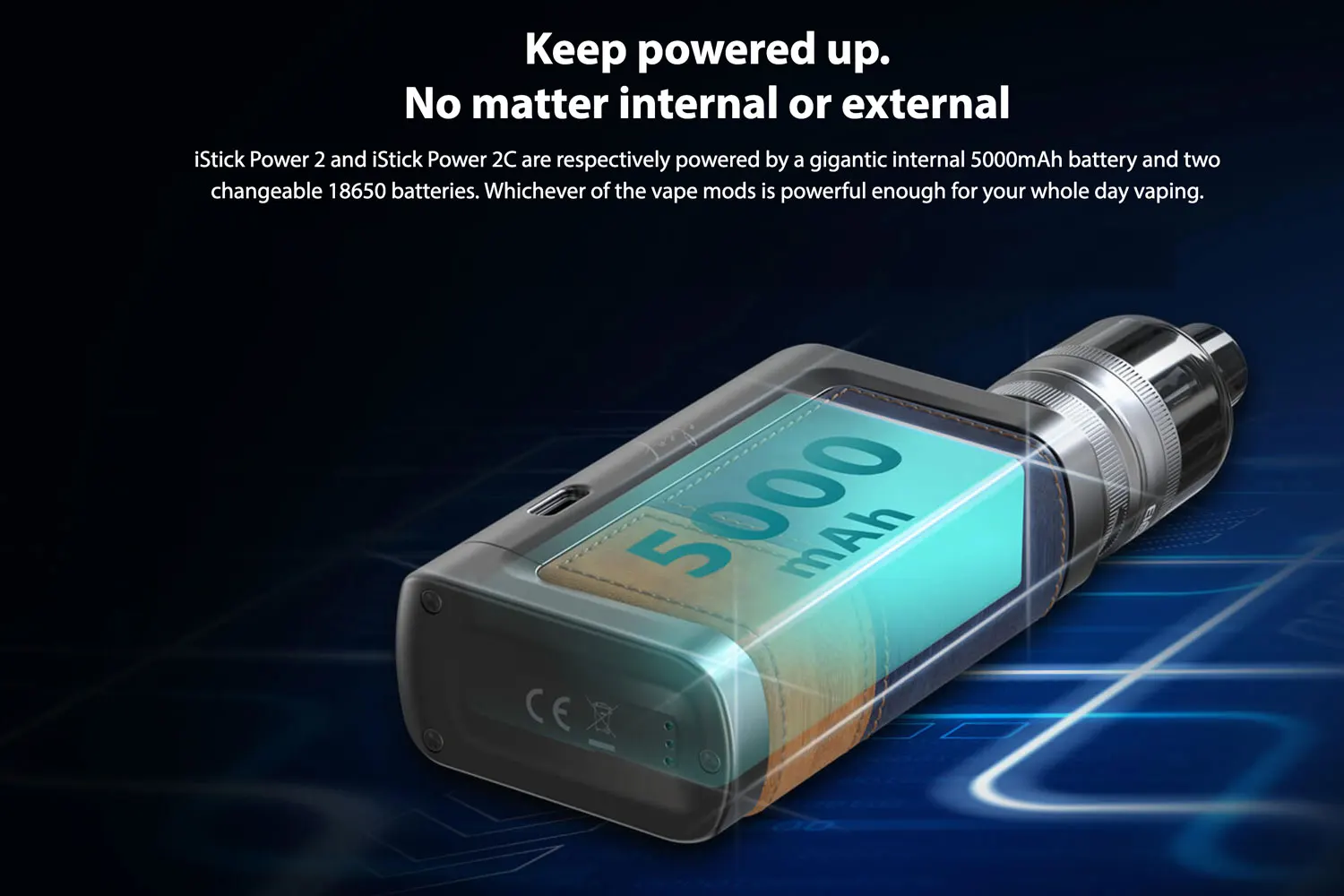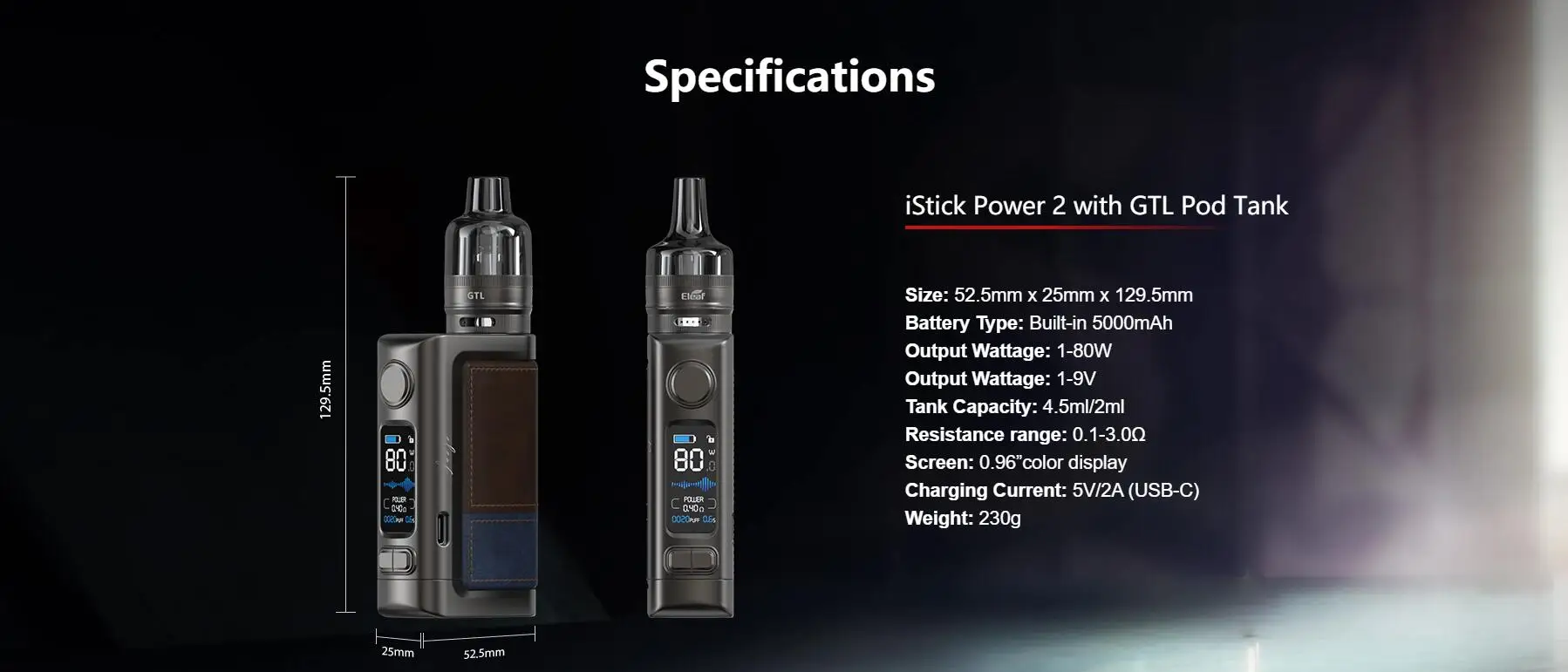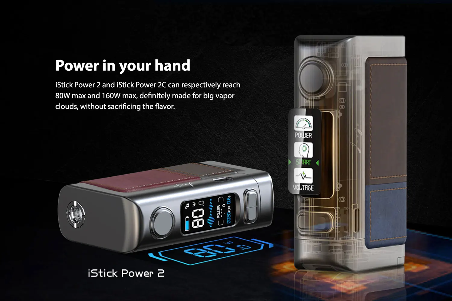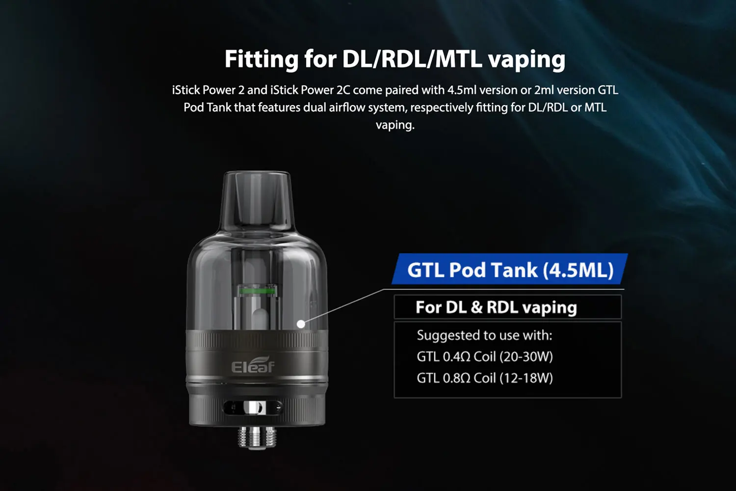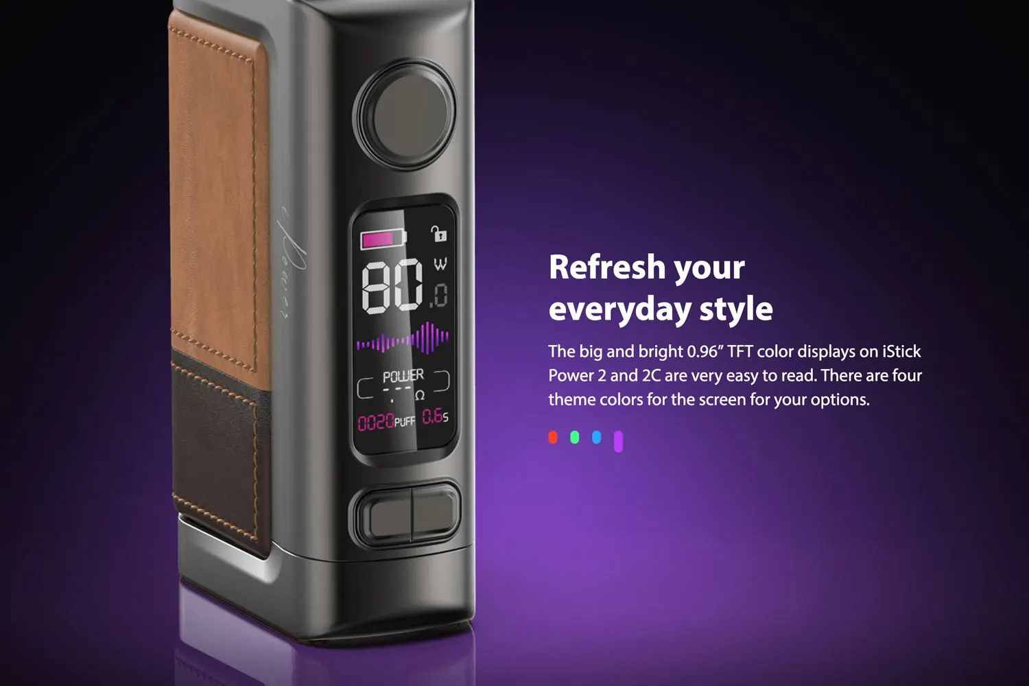 Heureux de présenter la prochaine générationEleaf iStick Power 2 Kit. Retour à la forme simpliste de la boîte d’origine iStick Power, iStick Power 2 présente un design élégant en cuir de bloc de couleur et est très confortable à tenir. Et l’eleaf iStick Power 2 est alimenté par une grande batterie intégrée de 5000mAh avec une charge rapide 2A. Deuxièmement, iStick Power 2 dispose d’une puce intelligente à l’intérieur pour prendre en charge le mode d’alimentation, le mode intelligent et le mode tension qui ont les fonctions de recommander intelligemment la puissance/tension optimale pour différentes bobines et de se souvenir de vos paramètres habituels. Doté du grand écran d’affichage couleur TFT lumineux de 0.96 pouces, vous pouvez facilement lire les dates de vaporisation et choisir votre couleur de thème préférée. De plus, l’eleaf iStick Power 2 est équipé d’un réservoir de 4.5ml GTL Pod. LeGTL Pod RéservoirDispose d’un système à double flux d’air, convenable respectivement pour DL/RDL ou MTL vapotage. PlusBobine GTL 0,4 ohm/bobine GTL 0,8 ohm, L’appareil Eleaf iStick Power 2 doit vous apporter une saveur optimale et un nuage massif. Veuillez vérifier sur le nouvel appareil Eleaf iStick Power 2