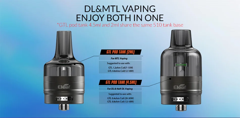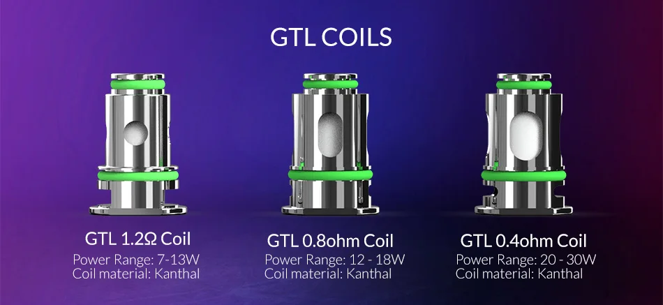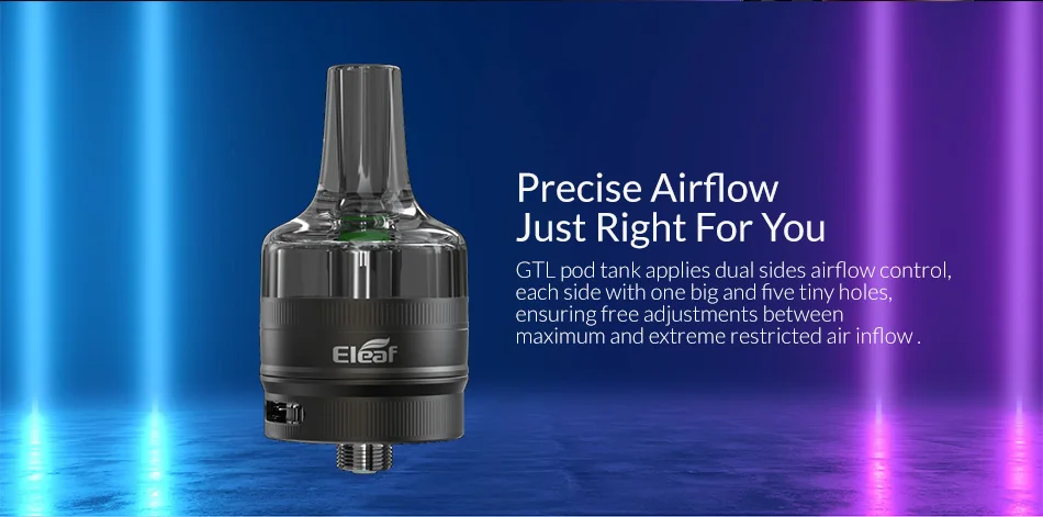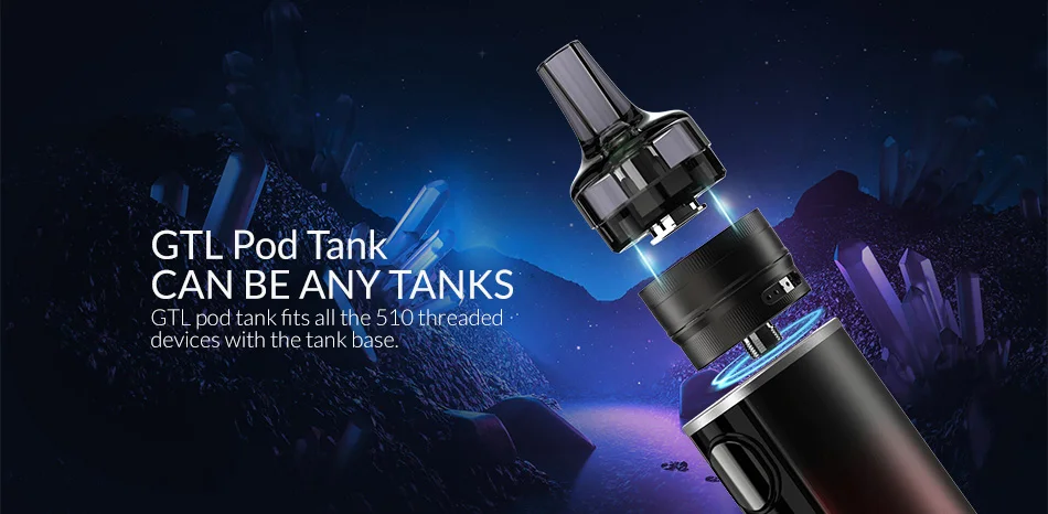 Le réservoir de dosette GTL est un réservoir de dosette polyvalent et adaptable avec une base de 510, qui est composé de deux cartouches de dosettes rechargeables avec différentes capacités et formes et d’une base 510 avec une fente de flux d’air en bas. GTL Pod Tank a deux versions: 4.5ml et 2ml, et est conçu pour différents styles de vapotage. Le réservoir de 4.5ml GTL Pod est conçu pour DL & Half DL vapotage, le réservoir de 2ml GTL Pod est conçu pour MTL vapotage. Le remplissage par le bas fournit une méthode de recharge simple, ce qui réduit également le risque de fuite. Compatible avec toutes les séries de bobines GTL, y compris la nouvelle bobine GTL 0,8 ohm. La connexion 510 se fixe rapidement et de manière transparente via des connecteurs magnétiques puissants pour passer facilement du «pod» au «réservoir». La base 510 a une valve de débit d’air réglable qui vous permet de contrôler l’entrée d’air de chaque vape. Pour changer le flux d’air, il suffit de tourner la base pour trouver le réglage idéal pour le coup de gorge idéal.