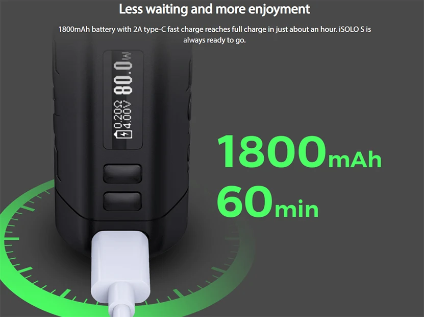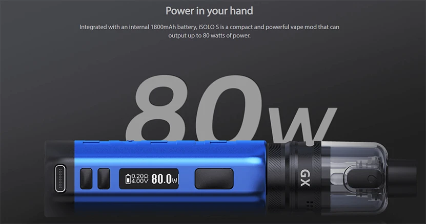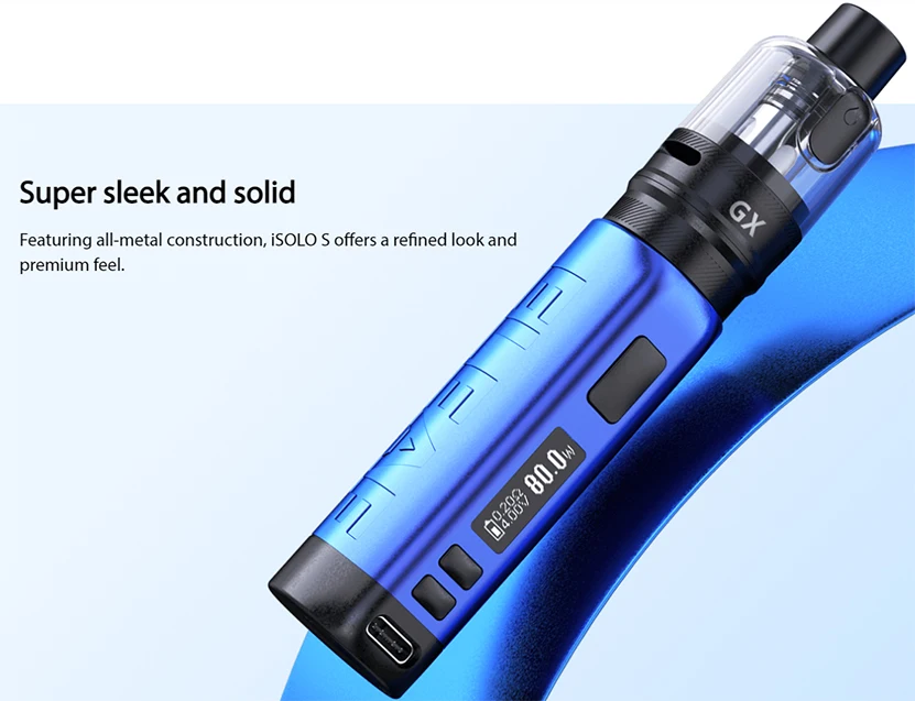 Le Kit insulo S combine le mod insulo S 80W avec le réservoir GX. Il est fait de matériaux entièrement métalliques pour offrir un look raffiné et une sensation premium. Le Kit Eleaf insulo S comprend une batterie built-in1800mAh avec une puissance maximale de 80W, ce qui le rend très compact et puissant. Avec une charge rapide de type C de 5V/2A, le Kit insulo S peut être complètement chargé en environ une heure. Il dispose également de multiples protections telles que la protection contre les surcharges, la Protection contre les décharges excessives, la Protection contre les surintensités, la Protection contre les surcharges et la Protection contre les courts-circuits. Avec une capacité de 5ML, le réservoir GX Pod dispose d’un remplissage latéral facile pour empêcher efficacement les fuites. Le système de flux d’air redéfini et la connexion magnétique rendent le réservoir GX simple et polyvalent à utiliser. Le réservoir GX Pod utilise également de nouvelles bobines GX puissantes maximisant votre satisfaction de vapotage. L’acier inoxydable innovant à l’intérieur de la bobine GX avec structure en maille chauffe en 0.001S et supporte une durée de vie plus longue, ce qui peut stimuler la saveur ultra riche et pure. L’acier AST de la bobine GX est également combiné avec le jeu de puces à l’intérieur de iSOLO S pour garantir la protection intelligente de la bobine afin que l’appareil puisse arrêter la sortie lors de la détection d’un manque de protection de la bobine coups secs.