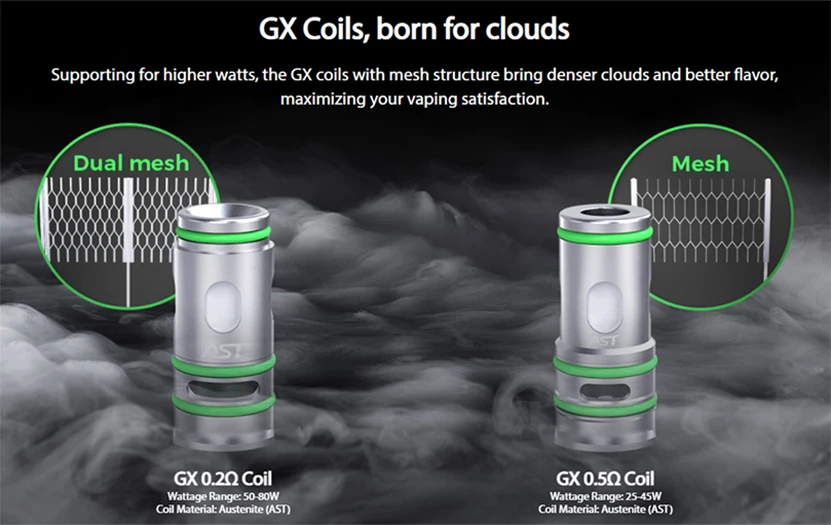 | Coil | GX 0.2ohm Coil(50-80W)/ GX 0.5ohm Coil(25-45W) |