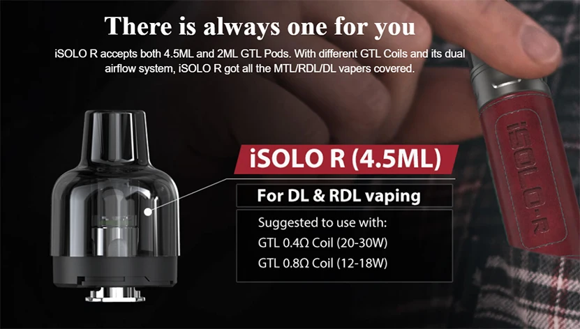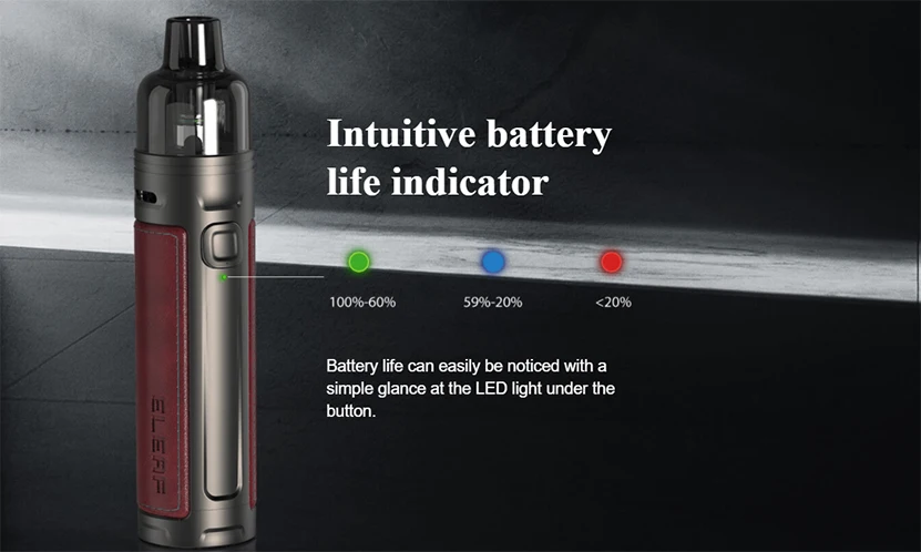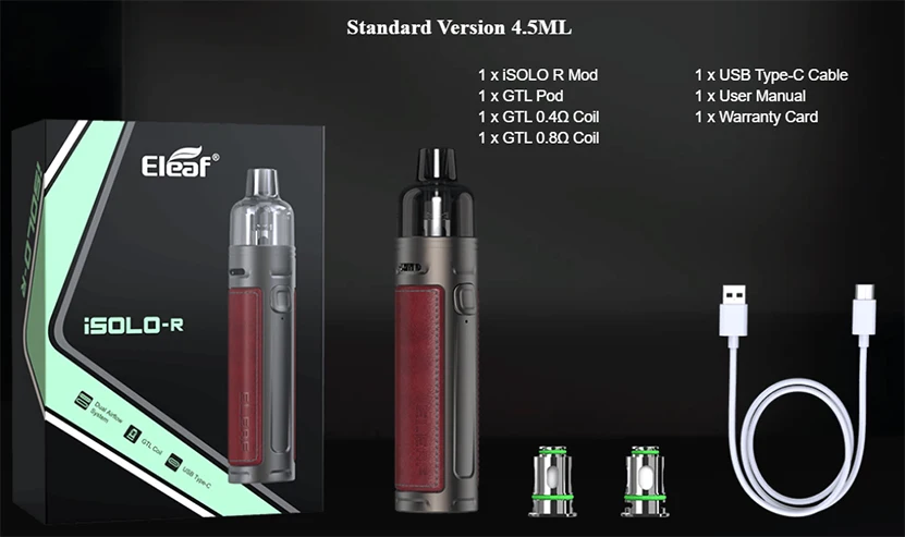 Le Kit insulo R est une nouvelle série pod mod vape d’eleaf. Il se compose d’isolo R Mod et de GTL Pod. La finition en cuir sur le Mod insulo R est un plaisir à tenir et à toucher. Le mod est alimenté par une batterie intégrée de 1800mAh, capable d’une puissance maximale de 30W. Vous pouvez facilement voir l’autonomie de la batterie avec la lumière LED sous le bouton. Il ne faudra qu’environ 50 minutes pour charger complètement le puissant mod avec USB type-c. iSolo R accepte les deux Pods GTL de 4.5ml pour répondre à vos besoins quotidiens. Avec différentes bobines GTL et son double système de flux d’air, insulo R a couvert toutes les vapeurs MTL/RDL/DL. Le Kit Eleaf insulo R apportera une merveilleuse sensation de vapotage pour les débutants et les vapeurs avancées.
