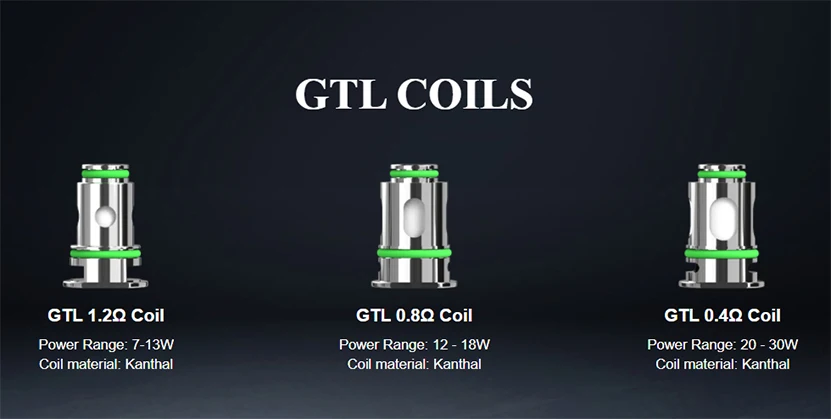 | Coil | GTL 0.4ohm Coil (KAL, 20-30W); GTL 0.8ohm Coil (KAL, 12-18W); GTL 1.2ohm Coil (KAL, 7-13W) |