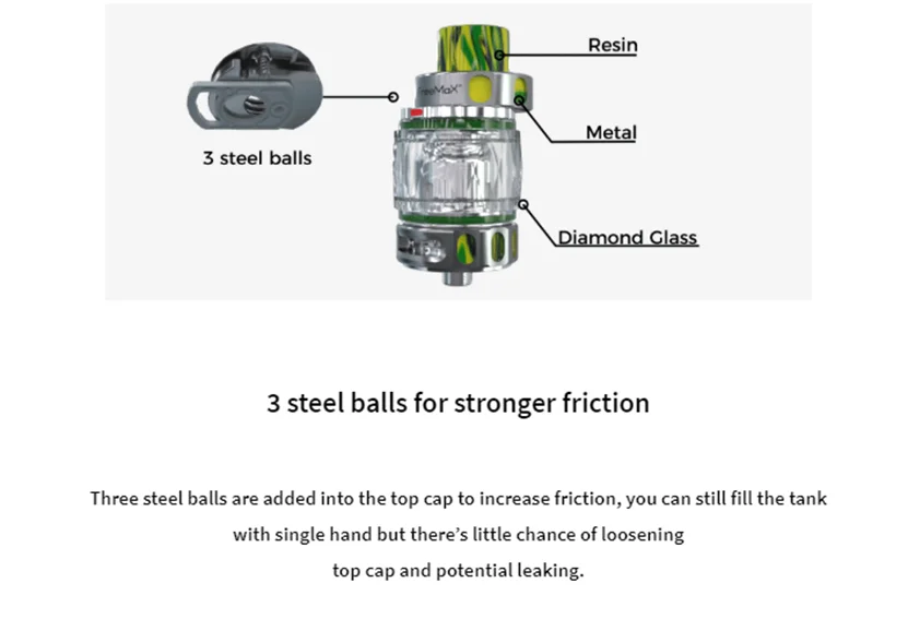 Le réservoir M Pro 2 est un réservoir de sub ohm élégant et durable. En tant que version mise à jour du réservoir M Pro, il est conçu de manière innovante avec trois billes d’acier dans le capuchon supérieur pour augmenter la friction, évitant ainsi les fuites. Avec une grande capacité d’e-liquide de 5ml, il peut vous fournir une expérience de vapotage durable. Et il adopte une conception de remplissage coulissant à ouvert pour un fonctionnement pratique. En outre, il est compatible avec un filetage 510 largement adaptable et une pointe d’égouttage 810 confortable. De plus, il convient aux bobines 904L M1, M2, M3 et M4 mesh, ce qui vous apportera une expérience de vapotage stable et satisfaisante.