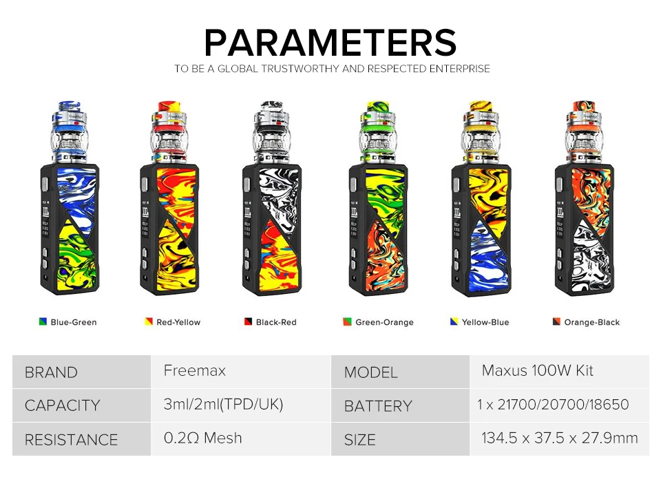 Le Kit Maxus 100W se compose du réservoir Fireluke 3 et du VWmod Maxus 100W. Équipé de maille SS904L de qualité militaire et de formule de coton en Fiber de thé, le Fireluke 3 peut vous offrir la meilleure expérience de vapotage. Le réservoir est conçu avec la combinaison de résine et de métal, ainsi que le verre en nid d’abeille élégant, Ce qui le rend si unique parmi tous les autres réservoirs. Il dispose également de trois mécanismes à billes en acier distinctifs pour une expérience de vapotage plus stable et plus excellente, et pour éviter les fuites potentielles. De plus, le Maxus 100W Mod est livré avec un écran OLED et dispose d’une liste complète de fonctions pour répondre à vos besoins. Se démarquer du reste est sa caractéristique jamais vue auparavant de permettre l’utilisation de la batterie sans tenir compte de la polarité, et compatible avec les batteries 21700/20700/18650. Nous sommes fiers de vous présenter le Kit Freemax Maxus 100W.