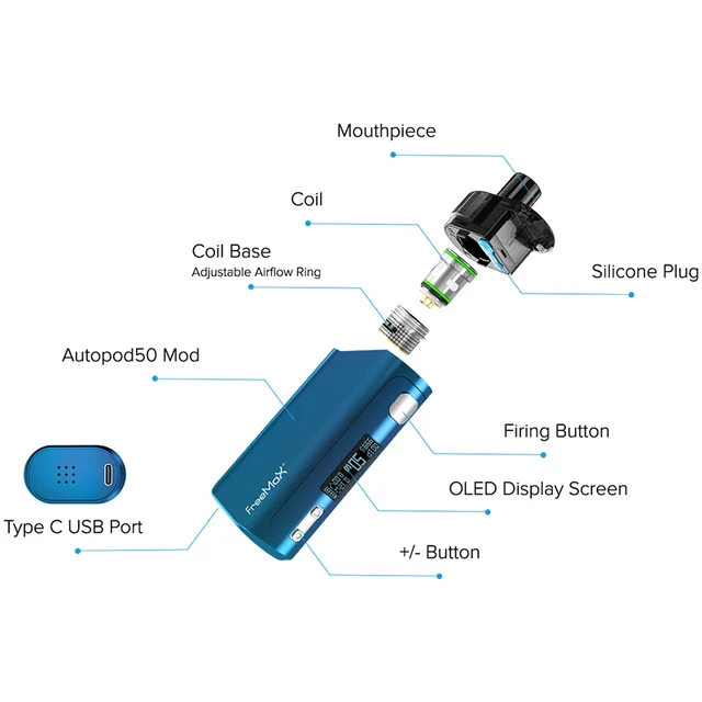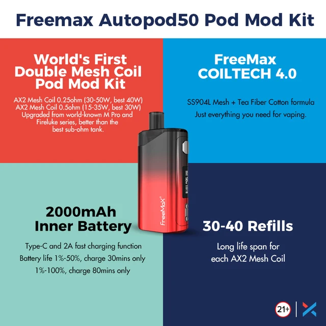 Freemax – Kit de vapoteur pour cigarettes électroniques, Original, Pod 50, bobine de maille AX2, batterie 2000mAh, 4ml, vapoteur