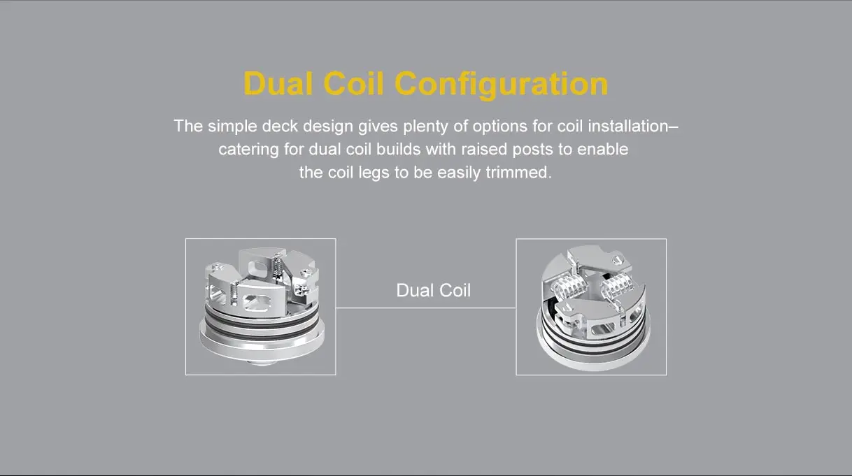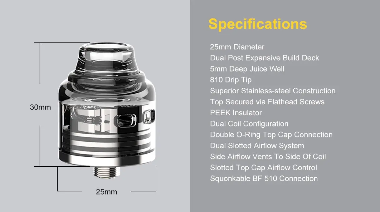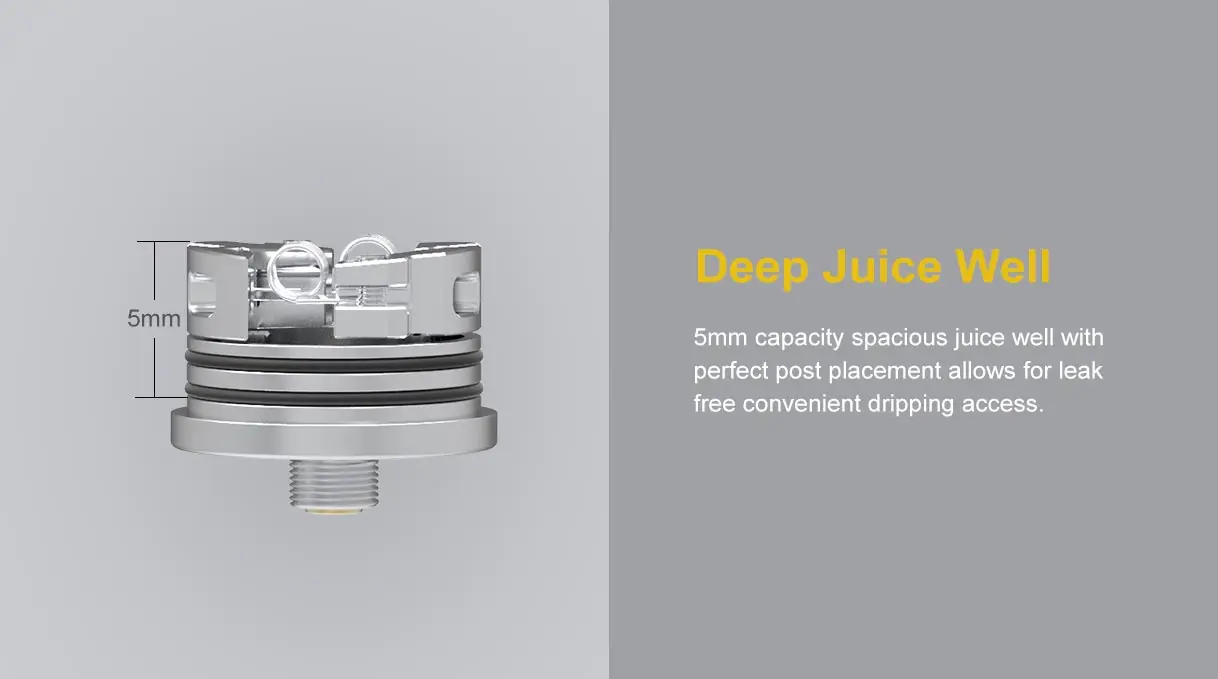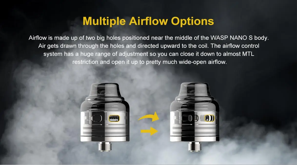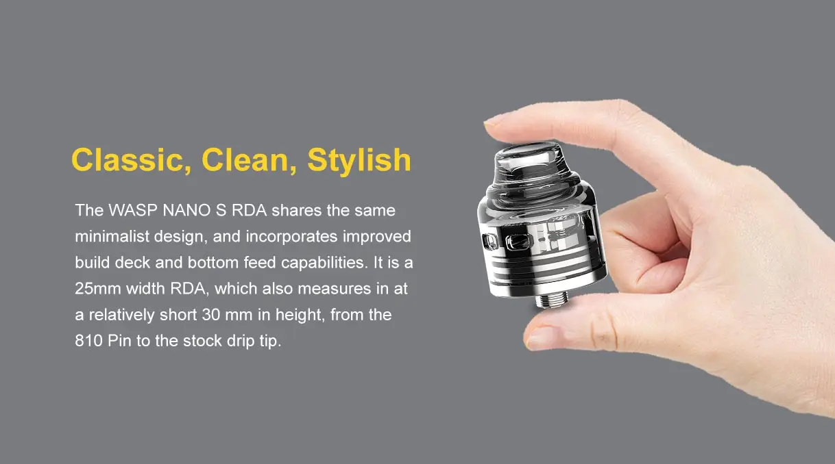 OumierWasp Nano S RDA, célèbre comme la version à double bobine de l’un des meilleurs Wasp Nano RDA à simple bobine, est un excellent atomiseur dégoulinant reconstructible. Il dispose de 25mm de diamètre, d’une grande capacité de 5ml de jus électronique et d’une pointe d’égouttage de 810. Et adoptant la connexion squonkable BF 510, il est compatible avec la plupart des mod du marché. En outre, il utilise la conception de pont simple pour une installation de bobine plus pratique. De plus, il prend en charge le contrôle du flux d’air du capuchon supérieur à double fente, qui a une énorme plage de réglage et vous permet de le fermer à une restriction presque MTL et de l’ouvrir à un flux d’air assez large.
