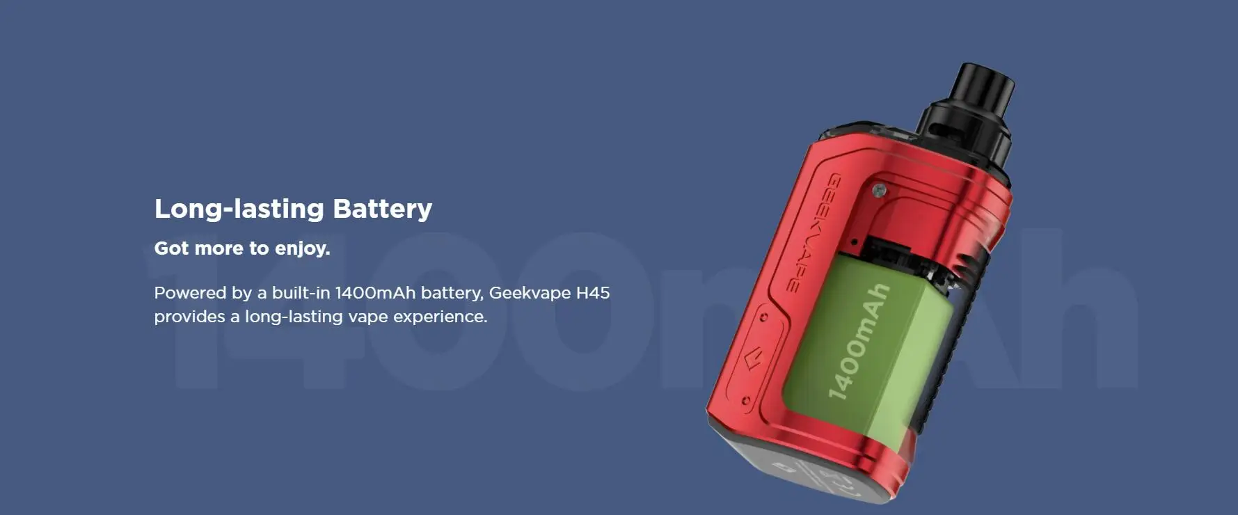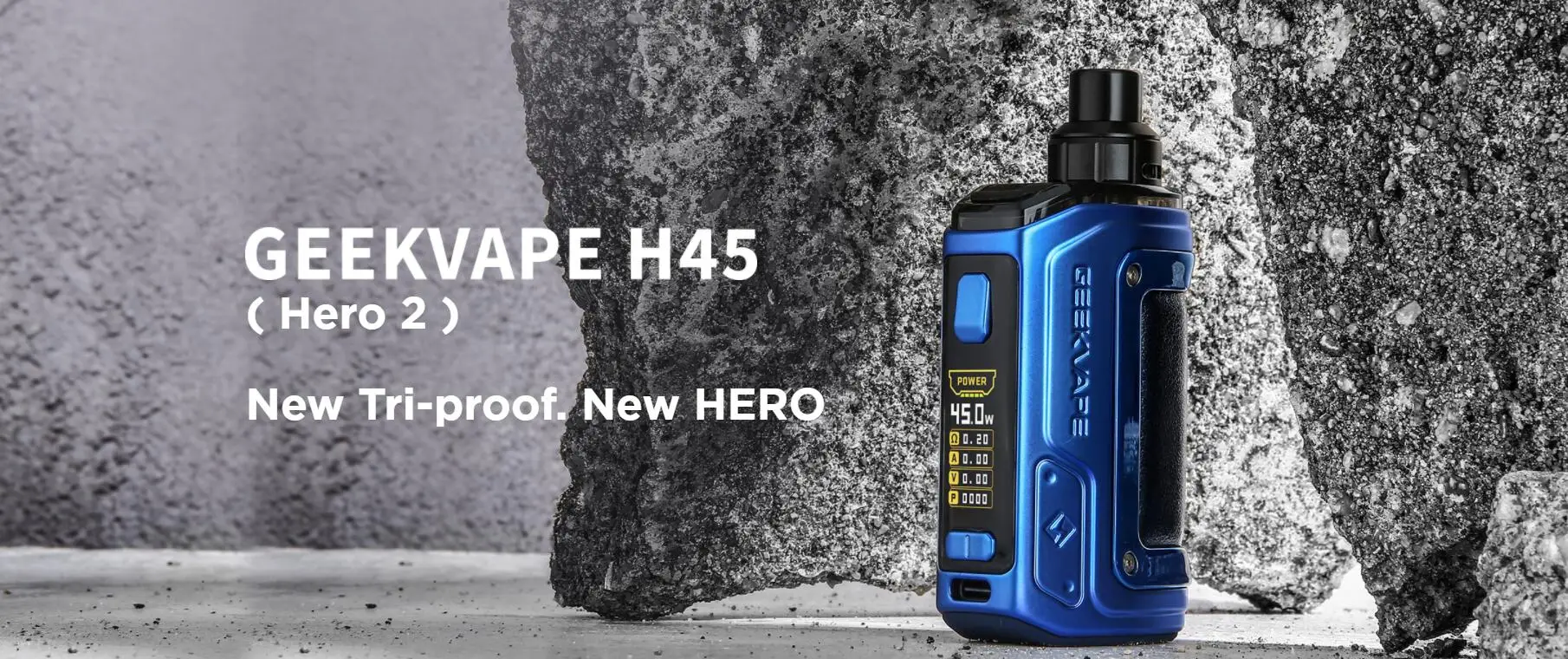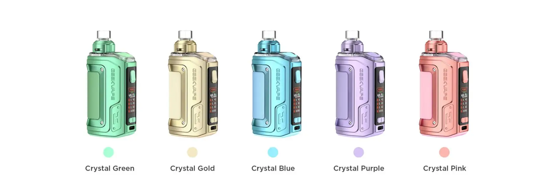 Le Kit H45 s’appelle aussi le Kit Aegis Hero 2. La nouvelle technologie tri-proof est appliquée au Kit H45 pour le rendre plus résistant aux chocs et aux rayures. Construit avec une batterie de 1400mAh, vous pouvez profiter d’un vapotage de longue durée. De plus, le Kit Geekvape H45 utilise un système de sortie stable de tous les temps pour fournir une sortie stable et une saveur constante lorsque la batterie est faible. Et la gamme de puissance de sortie est de 5-45W. L’écran TFT 0.96 pouces vous montrera tous les détails du vapotage. La dosette H45 d’une capacité de 4ml présente un flux d’air supérieur et une conception étanche pour une saveur supérieure et un contrôle précis du flux d’air. Il est compatible avec les bobines de la série B de 0,6ohm et 0,4ohm.