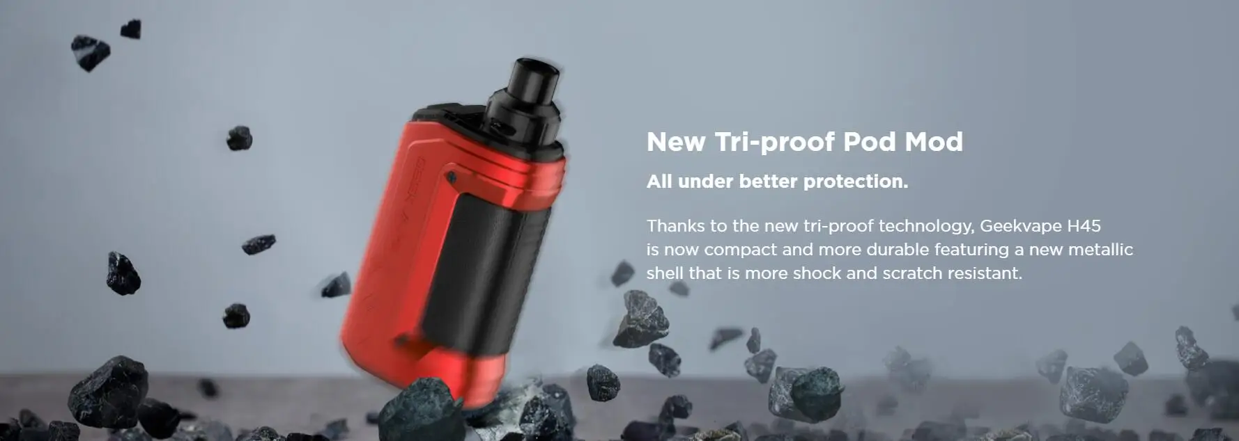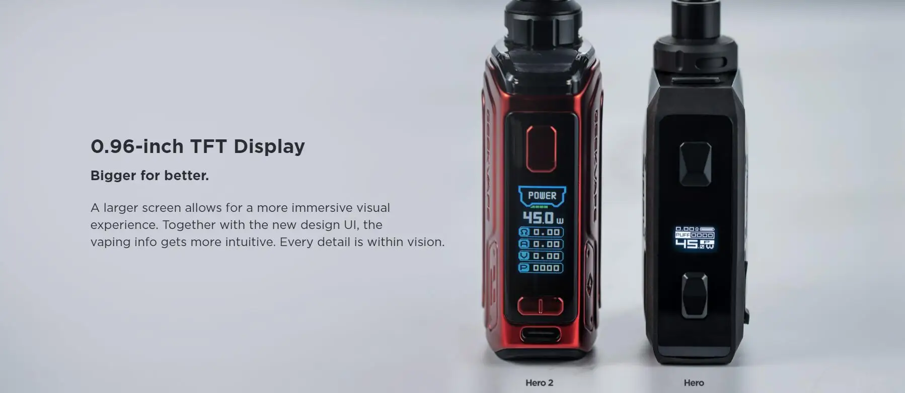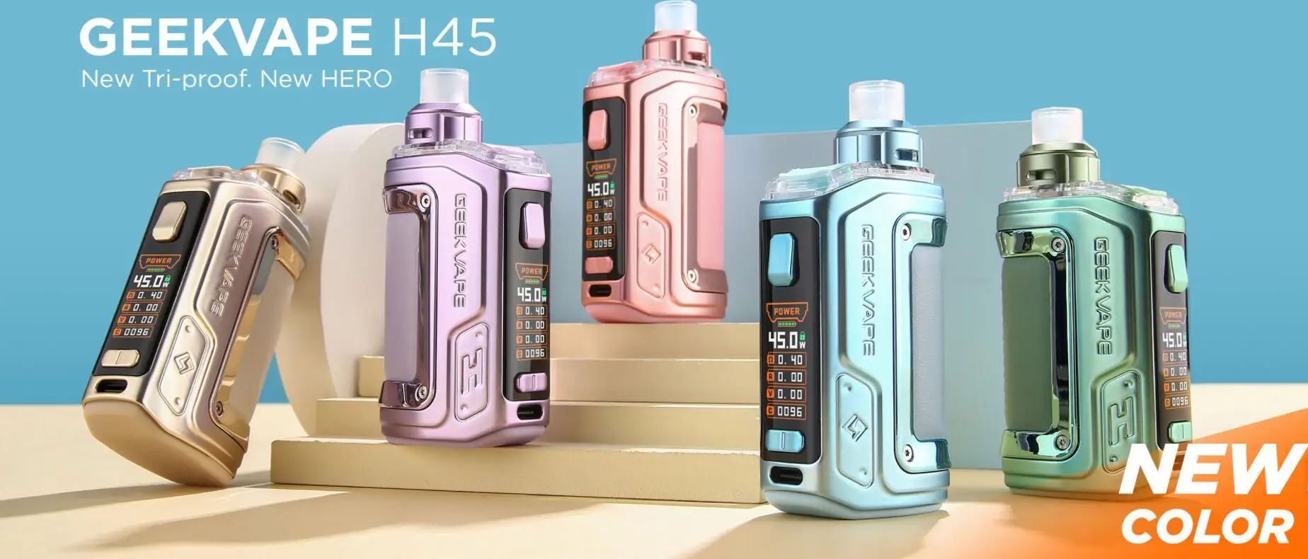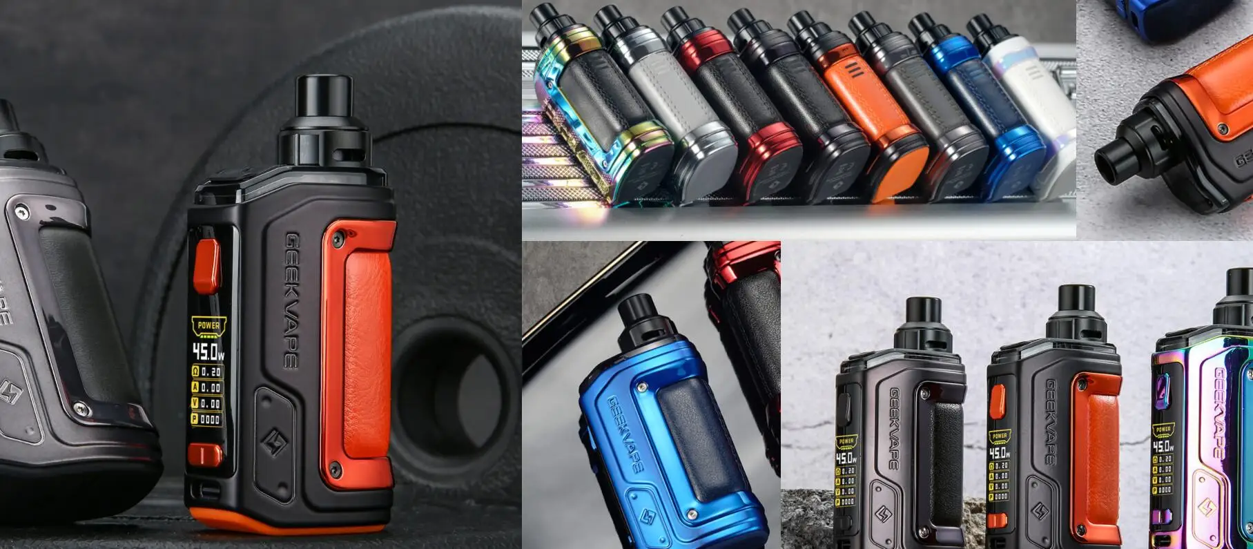 Le Kit H45 s’appelle aussi le Kit Aegis Hero 2. La nouvelle technologie tri-proof est appliquée au Kit H45 pour le rendre plus résistant aux chocs et aux rayures. Construit avec une batterie de 1400mAh, vous pouvez profiter d’un vapotage de longue durée. De plus, le Kit Geekvape H45 utilise un système de sortie stable de tous les temps pour fournir une sortie stable et une saveur constante lorsque la batterie est faible. Et la gamme de puissance de sortie est de 5-45W. L’écran TFT 0.96 pouces vous montrera tous les détails du vapotage. La dosette H45 d’une capacité de 4ml présente un flux d’air supérieur et une conception étanche pour une saveur supérieure et un contrôle précis du flux d’air. Il est compatible avec les bobines de la série B de 0,6ohm et 0,4ohm.