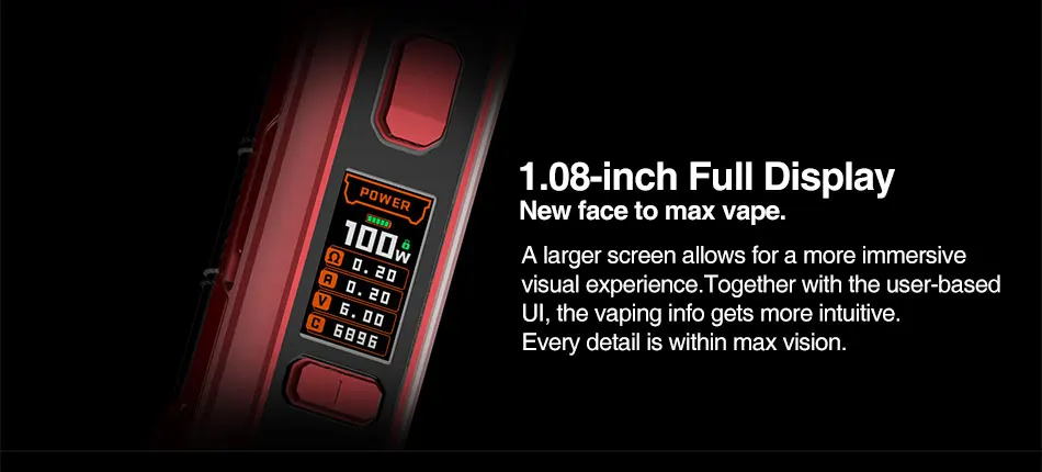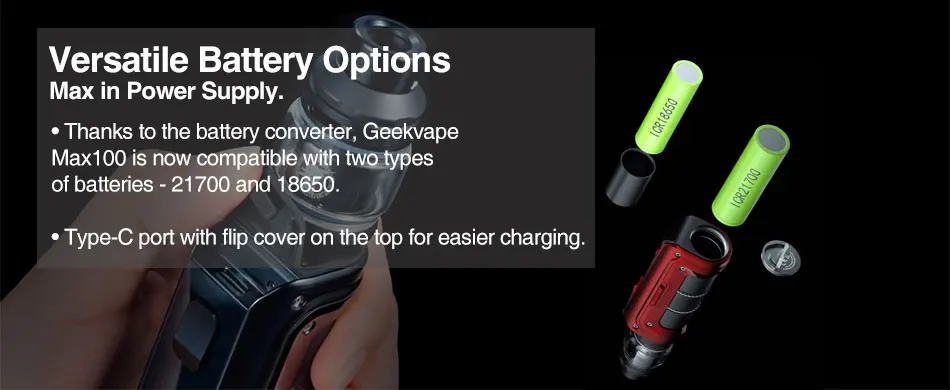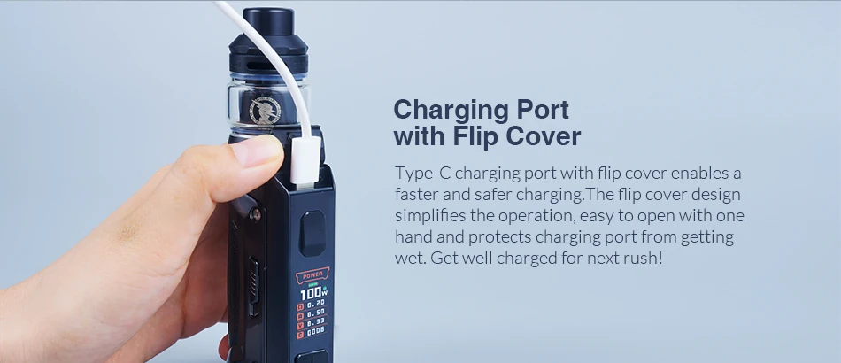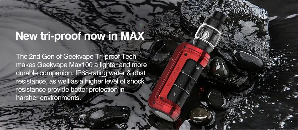 Max100 Mod utilise une nouvelle technologie tri-preuve, présente une résistance IP68-rating à l’eau et à la poussière, ainsi qu’un niveau plus élevé de résistance aux chocs, ce qui apportera à l’appareil de plus grandes protections. En outre, avec la conception de A-LOCK, la presse accidentelle peut être évitée, et vous pouvez empêcher les pressions de bouton involontaires de surchauffer vos bobines ou votre mod. Max100 Mod prend en charge une seule batterie 21700/18650, et un adaptateur de batterie 18650 est inclus dans l’emballage.