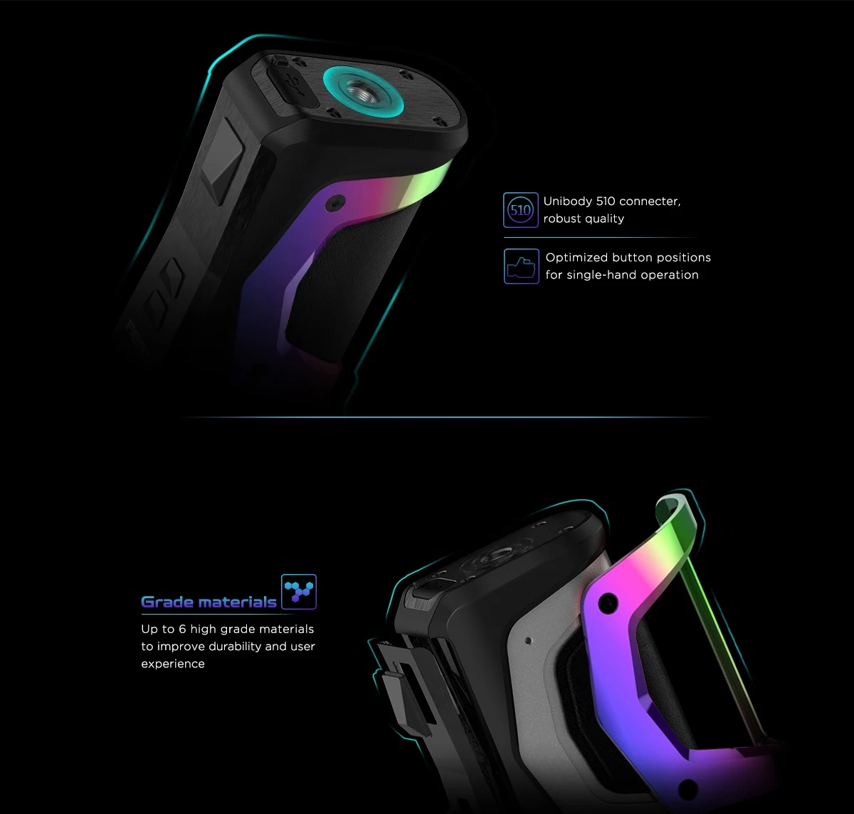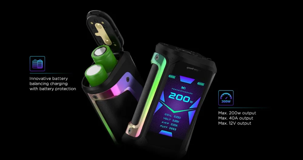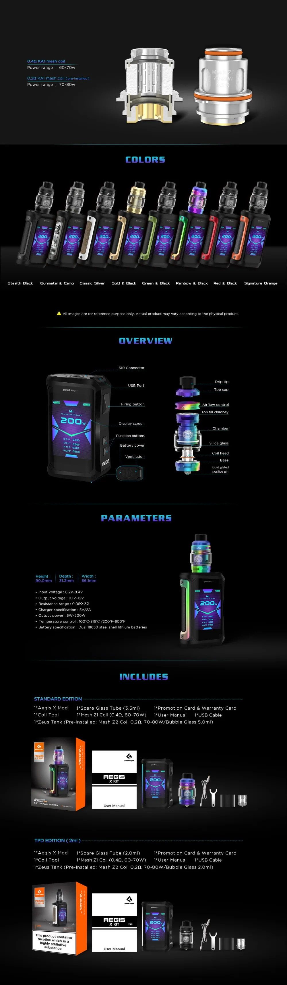 Geekvape Aegis X Zeus Kit inclus Aegis X Box Mod et Zeus Sub Ohm Tank. Il est étanche, antichoc et antipoussière et alimenté par deux batteries 18650 avec une puissance de sortie maximale de 200W. Équipé du nouveau jeu de puces AS2.0, l’aegis X prend en charge la mémoire (M1-4)/puissance/TC (SS, Ni, Ti, TCR)/ VPC et le mode de dérivation pour répondre aux différents besoins de vapotage.