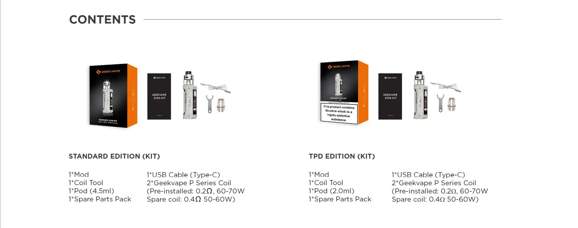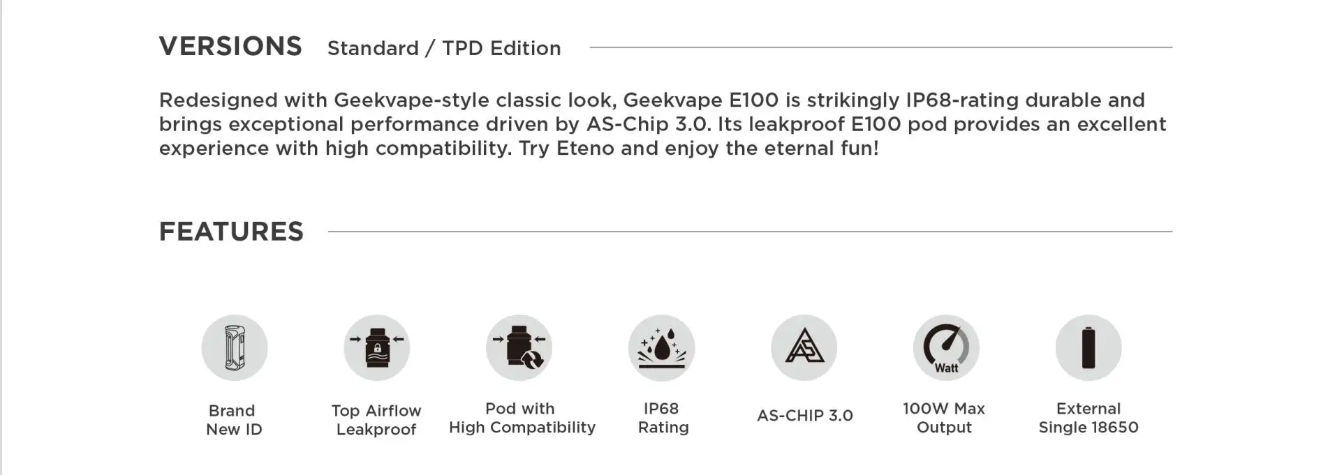 | Numéro de Modèle | GeekVape E100 (Aegis Eteno) Kit |