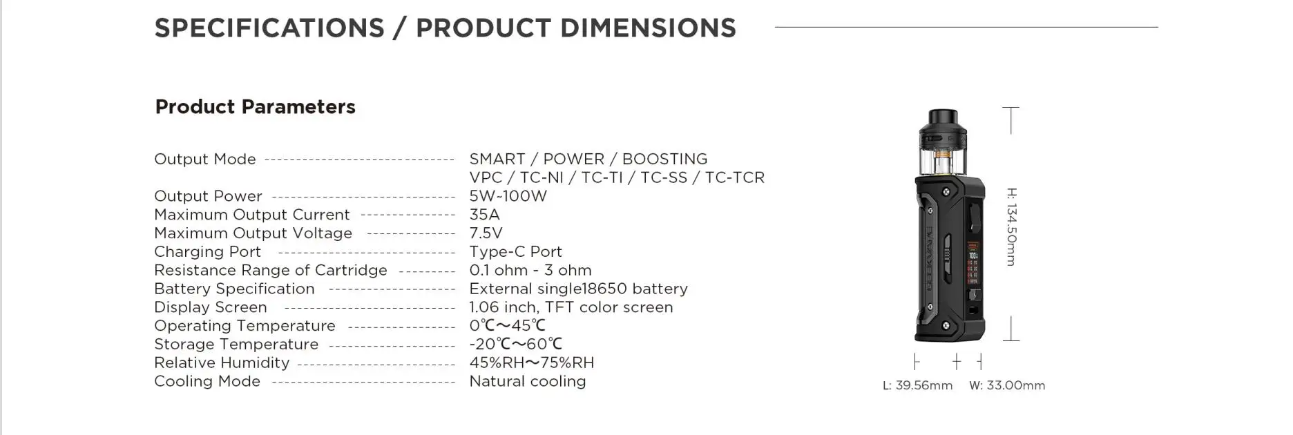 | Battery | Single external 18650 battery (Not included) |