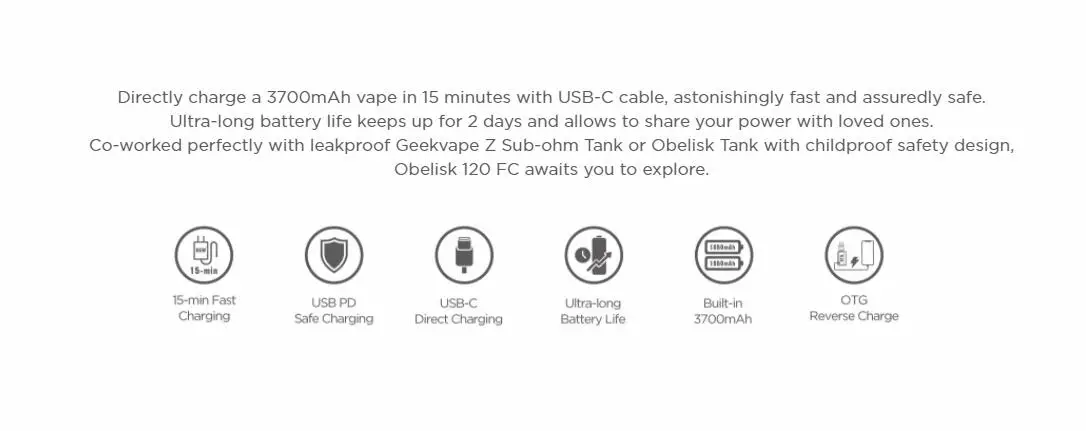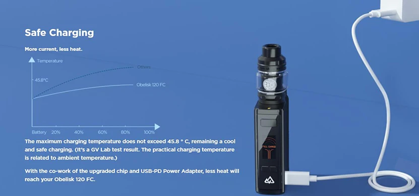 Obelisk 120 FC Z Kit est la combinaison de Obelisk 120 FC Mod et Z Sub Ohm Tank (Zeus Sub Ohm Tank). Le mod dispose d’une batterie intégrée de 3700mAh et peut être chargé directement et complètement en 15 minutes avec un câble USB-C pour deux jours d’utilisation. Moins de chaleur atteindra l’obelisk 120 FC avec la coopération de la puce améliorée et de l’adaptateur secteur USB-PD, ce qui rendra la charge plus sûre. De plus, l’adaptateur secteur USB-PD est compatible avec les appareils USB-C approuvés. Il prend également en charge le mode Power/TC-SS/TCR/VPC/Bypass/OTG. Associé au réservoir de 5ml Z Sub Ohm qui est livré avec un système de flux d’air de haut en bas étanche et adopte des bobines de série Z, le Kit oblisk 120 FC Z fournira une saveur et une vapeur massives. Il existe également un réservoir oblisk exclusif avec une conception de sécurité à l’épreuve des enfants pour plus de vapeur (vendu séparément).