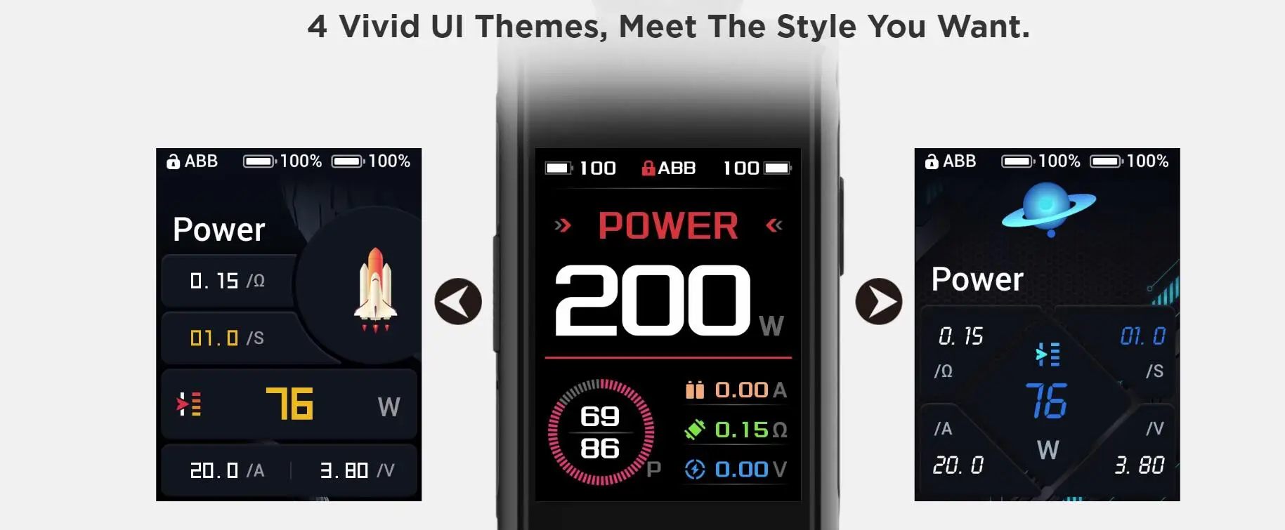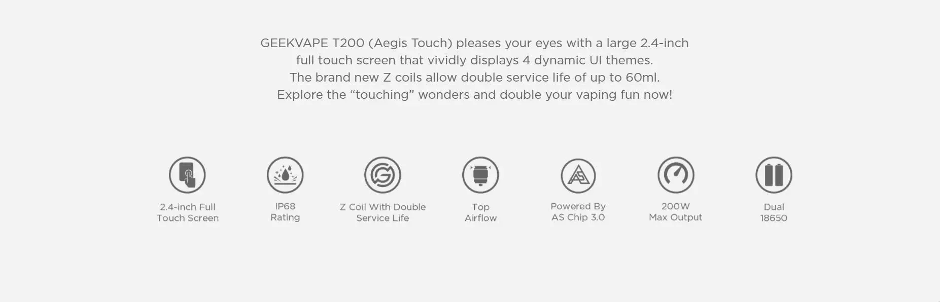 T200 Mod est alimenté par la puce AS 3.0 et deux batteries 18650 externes avec 200W max et type-c de charge. Conçu avec un écran tactile de 2.4 pouces, il dispose de 4 thèmes d’interface utilisateur vifs et de modes de sortie puissance, TC-SS, TC-TCR (VPC, Smart, by-pass) pour votre option. En adoptant la nouvelle technologie Tri-proof, GeekVape T200 devient plus compact. La IP68-rating résistance à l’eau et à la poussière et un niveau plus élevé de résistance aux chocs le rendent également durable en utilisation. GeekVape T200 (Aegis Touch) boîte Mod est adapté pour GeekVape Z Sub Ohm réservoir/Z Sub Ohm SE réservoir/Z bobine.