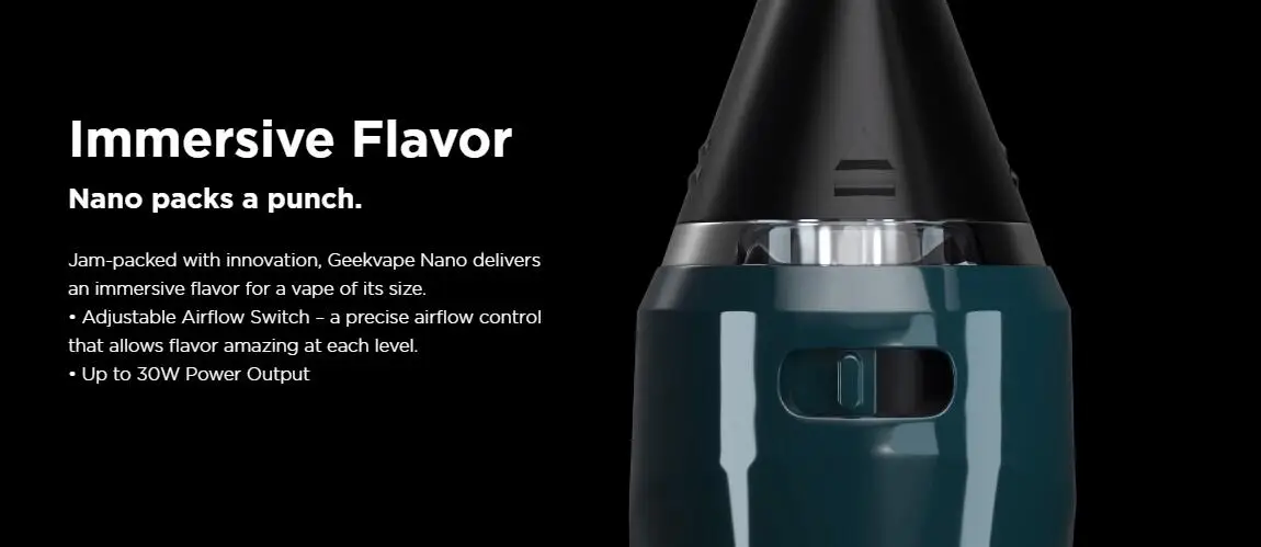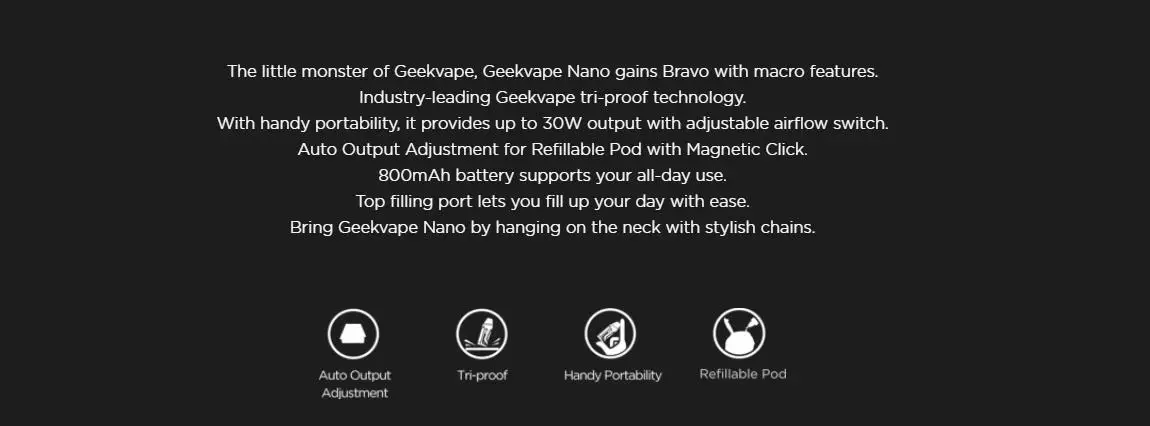 Aegis Nano Kit est livré avec une portabilité pratique qui peut fournir une sortie jusqu’à 30W avec un commutateur de débit d’air réglable. La technologie tri-proof Geekvape leader de l’industrie comprend la résistance aux éclaboussures et à l’eau, la résistance à la poussière et aux chocs. GeekVape Aegis Nano Mod est alimenté par une batterie intégrée de 800mAh qui peut servir une longue journée d’utilisation. Son commutateur de débit d’air réglable est un contrôle de flux d’air précis qui permet une saveur incroyable à chaque niveau. Geekvape Nano détectera automatiquement le nouveau pod remplacé et ajustera sa puissance de sortie en fonction de la résistance de la bobine pour répondre aux meilleures performances. La cartouche Aegis Nano Pod dispose d’une capacité de 2ml de jus électronique et d’un port de remplissage supérieur, adopte une conception étanche. Il offrira une merveilleuse expérience de vapotage MTL et RDL.