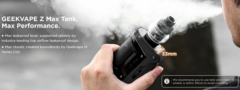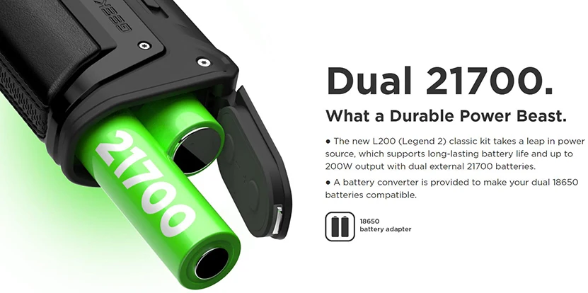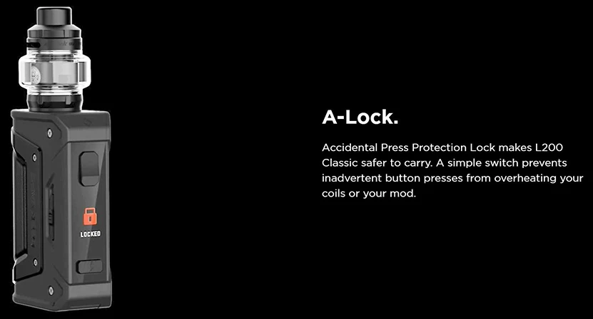 L200 Kit classique est la nouvelle Legend 2, nouvelle bête de puissance. Il dispose d’une nouvelle technologie tri-proof pour une plus grande durabilité, prend en charge la double batterie 21700/18650 pour fournir une autonomie de longue durée et une plage de puissance de 5W à 200W. De plus, avec le Mode boost, L200 Classic peut régler automatiquement la sortie max pour les nuages max. Le verrou de protection contre la pression accidentelle est ajouté pour rendre le L200 Classic plus sûr à transporter. Equipé du réservoir GeekVape Z Max qui dispose d’une capacité de 6ml e-jus, d’une conception étanche du flux d’air supérieur, il vous offrira des performances maximales. Nous vous recommandons d’utiliser un réservoir dont le diamètre de base est inférieur à 33mm pour éviter tout surplomb.