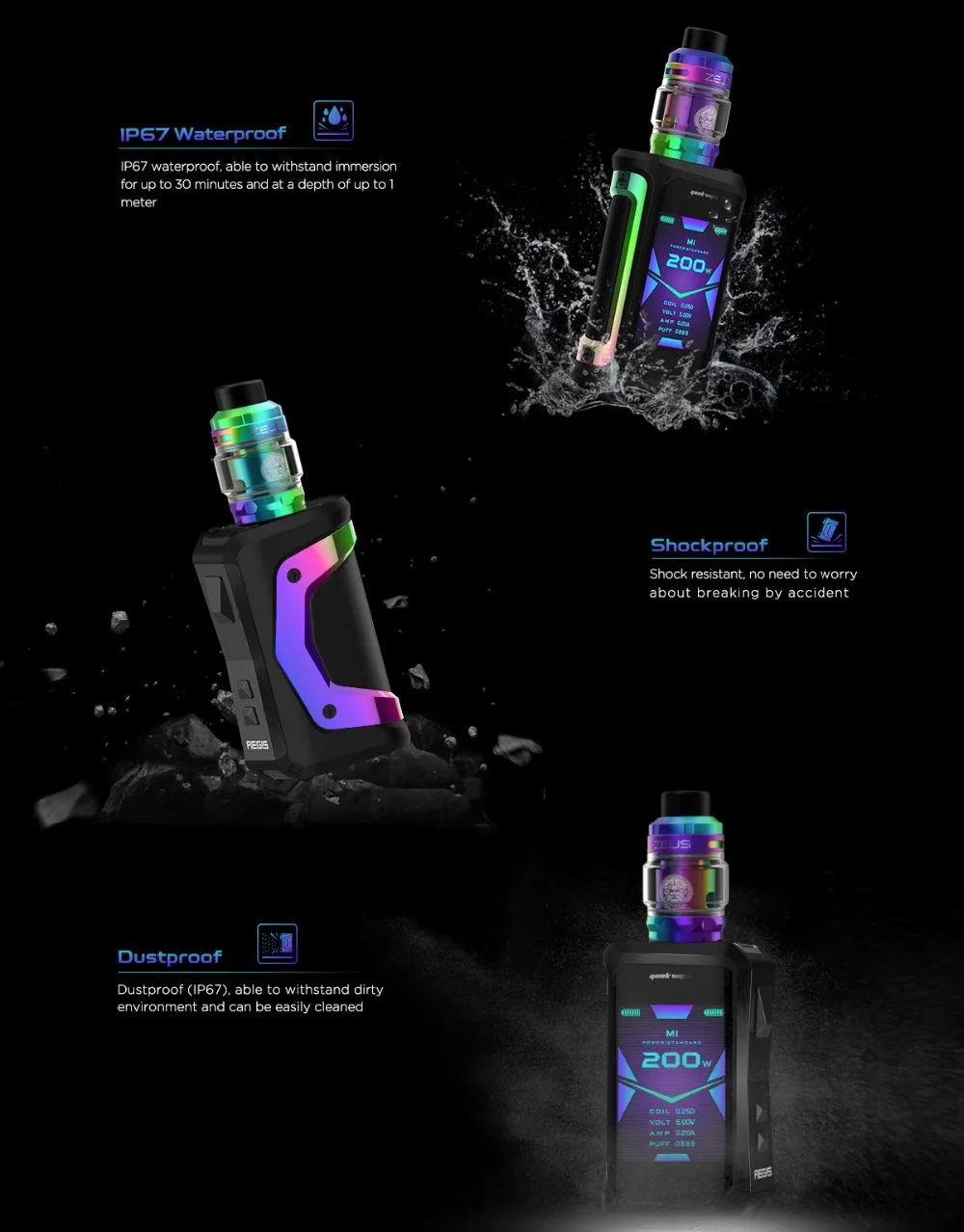 Geekvape Aegis X Zeus Kit inclus Aegis X Box Mod et Zeus Sub Ohm Tank. Il est étanche, antichoc et antipoussière et alimenté par deux batteries 18650 avec une puissance de sortie maximale de 200W. Équipé de la nouvelle AS2.0 chipset, L’égide X soutient Mémoire (M1-4)/Puissance/TC (SS, Ni, Ti, TCR)/ VPC et mode Bypass pour répondre aux différentes vaping.
