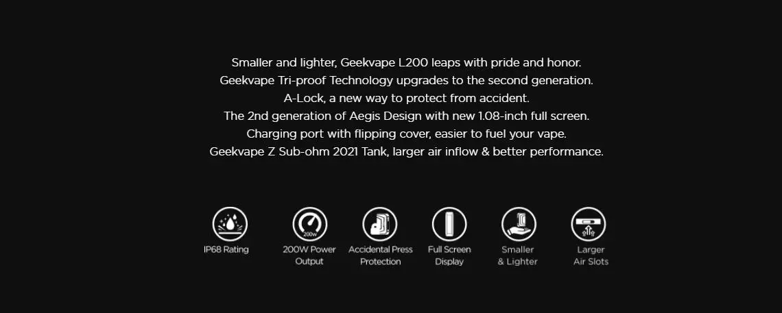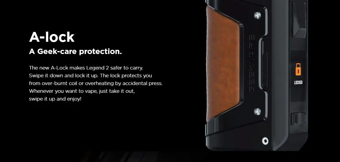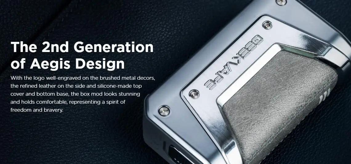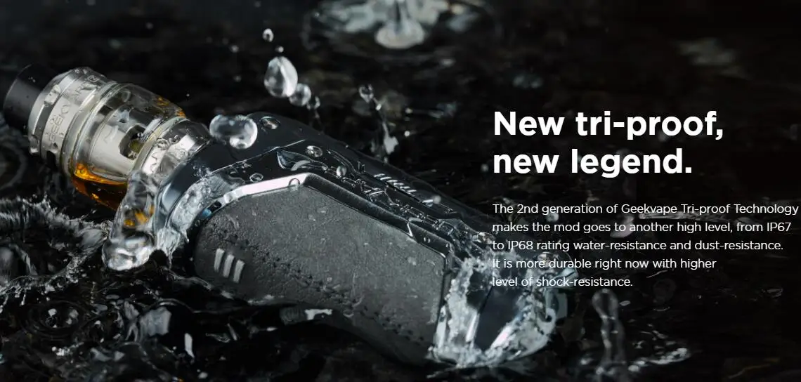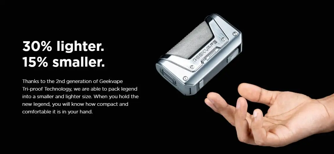 Aegis Legend 2 Kit est conçu avec un Mod Aegis Legend 2 de 200W et un réservoir Z Sub Ohm 2021. Il est plus petit et plus léger, compact et confortable à utiliser. En utilisant la 2ème génération de technologie tri-proof GeekVape, Aegis Legend 2 Mod passe à un autre niveau élevé. Doté d’un indice de résistance à l’eau et à la poussière de IP67 à IP68, il est plus durable avec un niveau de résistance aux chocs plus élevé. De plus, il a une large plage de température de fonctionnement: vers le bas de-20 ℃ ou jusqu’à 50 ℃. Il existe la nouvelle conception a-lock pour vous protéger contre la surchauffe de la bobine ou la surchauffe par pression accidentelle. L’écran plein écran de 1.08 pouces vous apportera une nouvelle expérience de vapotage pratique. Afin de faciliter le chargement, le port de chargement est conçu avec un couvercle rabattable, vous pouvez ouvrir le couvercle de chargement facilement d’une seule main et pas besoin de vous soucier de la résistance à l’eau. Le réservoir GeekVape Z Sub Ohm 2021 a une capacité de 5.5ml, dispose d’un système de flux d’air supérieur étanche et d’un flux d’air réglable. Il est compatible avec la bobine GeekVape série Z.
