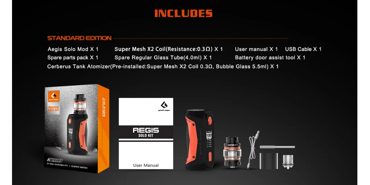 GeekVape – Kit de Cigarette électronique Aegis Solo, 100W, avec vaporisateur à bobine Mech X2, réservoir de 5.5ml, Cerberus Subohm