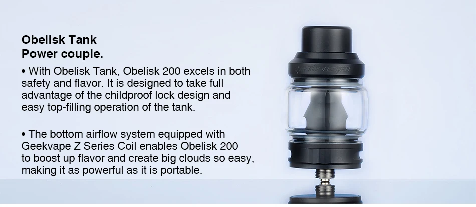 Le réservoir Obelisk a une capacité de 5.5ml d’e-liquide, il est conçu pour profiter pleinement de la conception de verrouillage à l’épreuve des enfants et de l’opération de remplissage par le haut facile du réservoir. Le système de flux d’air inférieur équipé de la bobine Geekvape série Z permet à oblisk 200 d’augmenter la saveur et de créer de gros nuages si facilement, le rendant aussi puissant que portable.