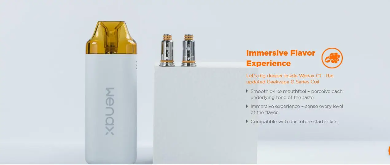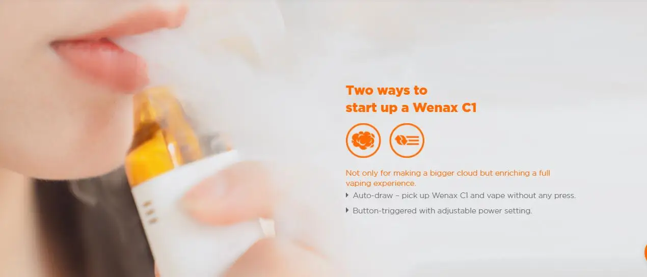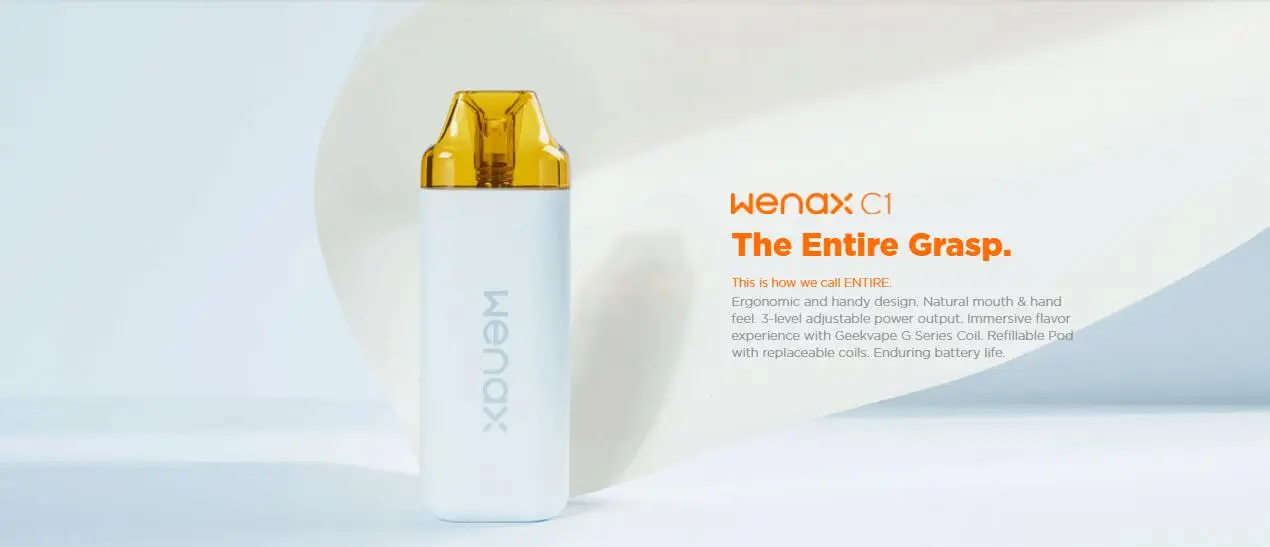 Le Kit Wenax C1 est un kit de système de dosette ergonomique et pratique et vous procurera une sensation de bouche et de main naturelle. Il est construit avec une capacité de batterie de 950mAh pour vous apporter une vaporisation toute la journée. Vous pouvez démarrer le Wenax C1 de deux façons: auto-tirage (vape sans aucune pression), déclenchement par bouton (avec réglage de puissance réglable). Et il est livré avec une puissance de sortie réglable à 3 niveaux: faible, moyen et élevé. Avec un pod rechargeable de 3ml qui présente une conception remplaçable par bobine, il est facile à utiliser. Adoptant les bobines de la série GeekVape G, il vous offrira une expérience immersive. Il suffit de prendre Wenax C1 pour profiter d’un vapotage entièrement agrippant!