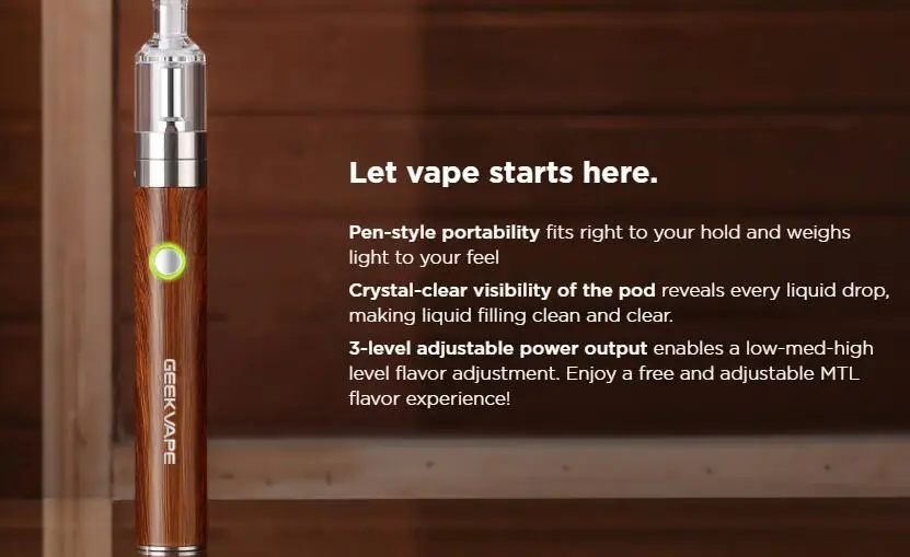 Le Kit de stylo G18 est un Kit de démarrage de saveur et de couleur. Le stylo en forme de corps vient avec construit-dans 1300mAh batterie, il supporte une journée vaping et USB-C Port permet un chargement pratique. La puissance de sortie réglable à 3 niveaux permet un réglage de la saveur de niveau bas-moyen-haut. Le pod visible transparent de 2ml est livré avec un design de pont étanche. Avec le système de flux d’air inférieur réglable, le stylo G18 offre une expérience MTL durable et facile à utiliser. GeekVape G18 Pen Kit est compatible avec la bobine de la série G. Huit couleurs vives sont disponibles.
