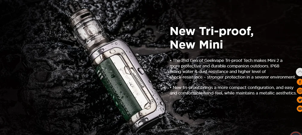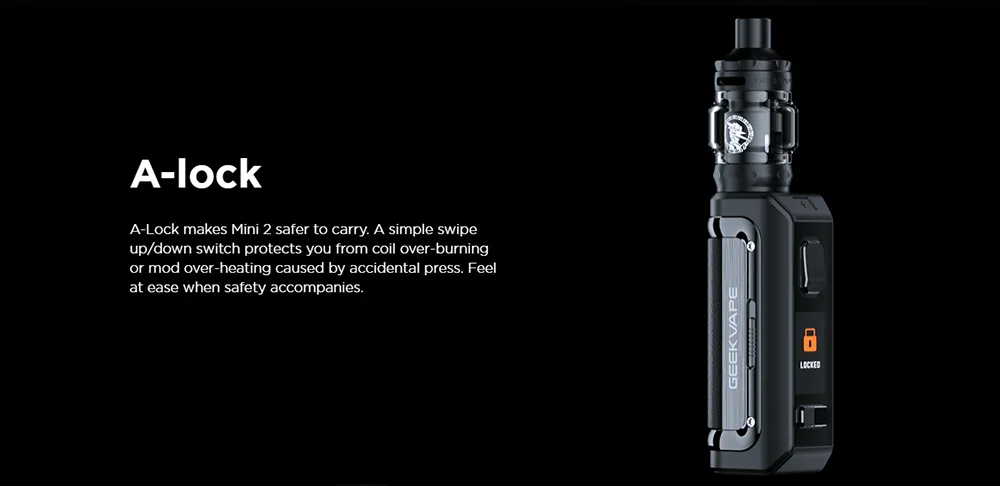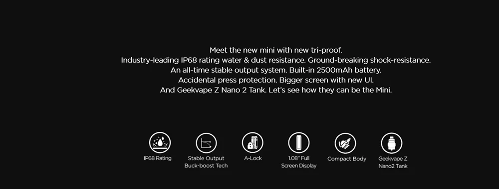 Geekvape M100 (Aegis Mini 2) Kit avec Z (Zeus) Nano 2 réservoir 3.5ml rencontre le nouveau mini avec le nouveau tri-proof. Aegis Mini 2 Kit avec indice de résistance IP68 à l’eau et à la poussière, leader de l’industrie. Résistance aux chocs révolutionnaire. Un système de sortie stable en permanence. Batterie intégrée de 2500mAh. Accidentelle presse protection. Écran plus grand avec nouvelle interface utilisateur. Port de chargement de Type C avec couvercle rabattable étanche. Et Geekvape Z Nano 2 Tank. Voyons comment ils peuvent être les Mini.