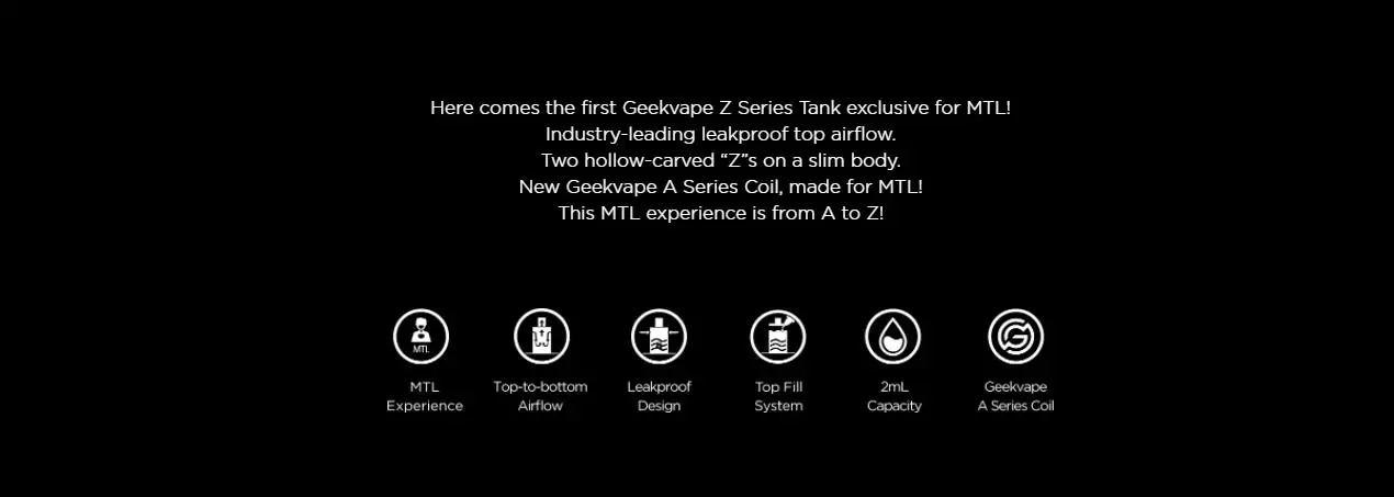 Geekvape Z MTL Tank signature un design de réservoir élégant avec deux «Z» sculptés en creux pour sa capacité de vape de 2ml, équilibrant à la fois élégance et performance. Accéder à ce verre transparent «Z», remplir et vérifier votre est un morceau de tarte. Ce réservoir fonctionne conjointement avec les entrées d’air, vous permettant d’obtenir une saveur satisfaisante et une vapeur délicieuse à volonté. Plus de crainte de fuite pour avoir une expérience salissante, le réservoir Z est livré avec une conception étanche de niveau Z à la pointe de l’industrie pour même zéro fuite. Grâce à la nouvelle bobine Geekvape de la série A et au système de flux d’air parfait de haut en bas, une saveur plus dense et plus riche est la meilleure pour votre vapotage MTL. Toutes ces fonctionnalités font de ce réservoir votre appareil préféré.