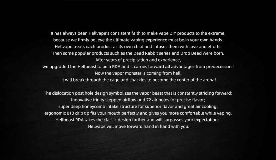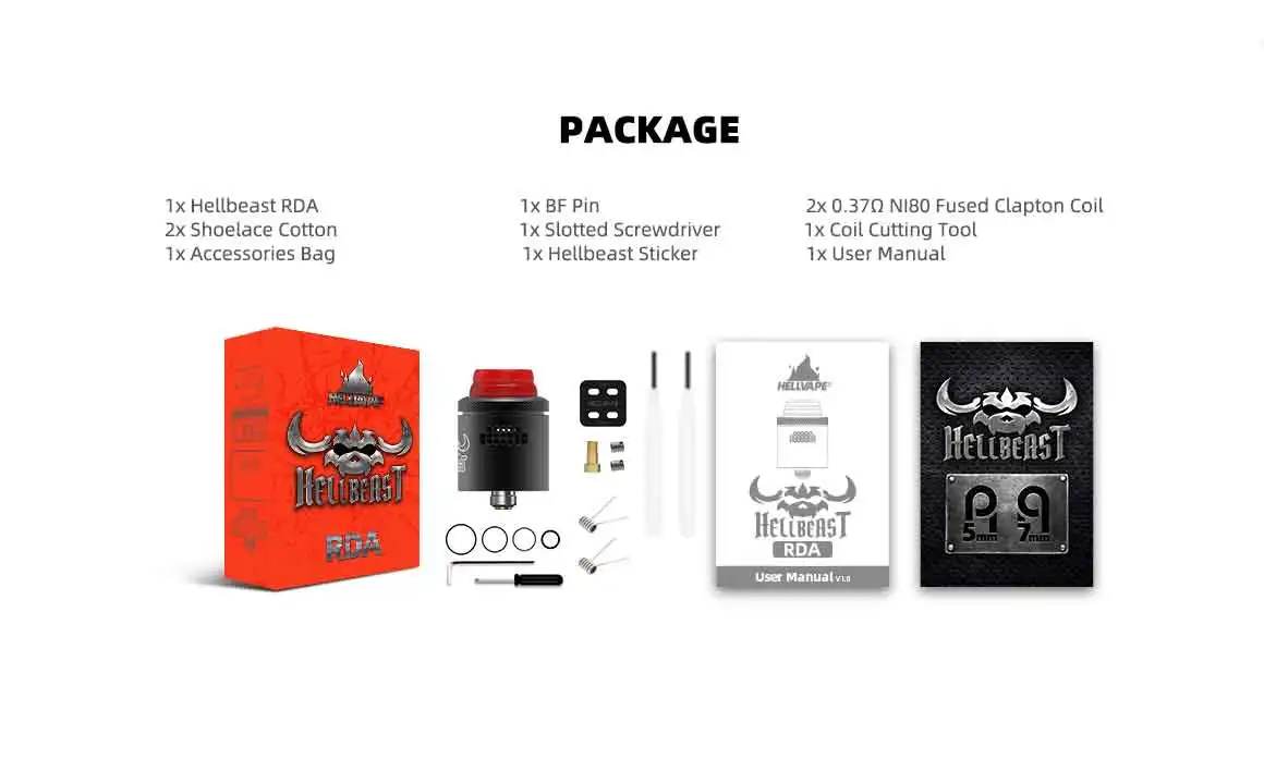 Hellbeast RDA est un atomiseur dégoulinant reconstructible qui adopte le pont de poteau créatif de 24mm de diamètre pour un grand espace de construction, rendant l’installation de la bobine facile. Il est parfait pour les bobines dans le sens antihoraire plug and play, pratique à utiliser sans beaucoup de réglage de la bobine. De plus, il y a 72 trous d’air de 1.2mm avec une immersion de 15 degrés pour frapper directement les bobines. Avec un contrôle précis de la saveur et une structure d’admission en nid d’abeille super profonde, il vous apportera une saveur supérieure et un excellent refroidissement de l’air. En outre, il dispose d’un jus de 5mm de profondeur bien pour assurer un squonking excessif. Et le trou dip BF de 45 degrés guidera rapidement. Avec l’embout ergonomique 810 goutte à goutte, il est capable de vous rendre plus confortable lors de la vaporisation.
