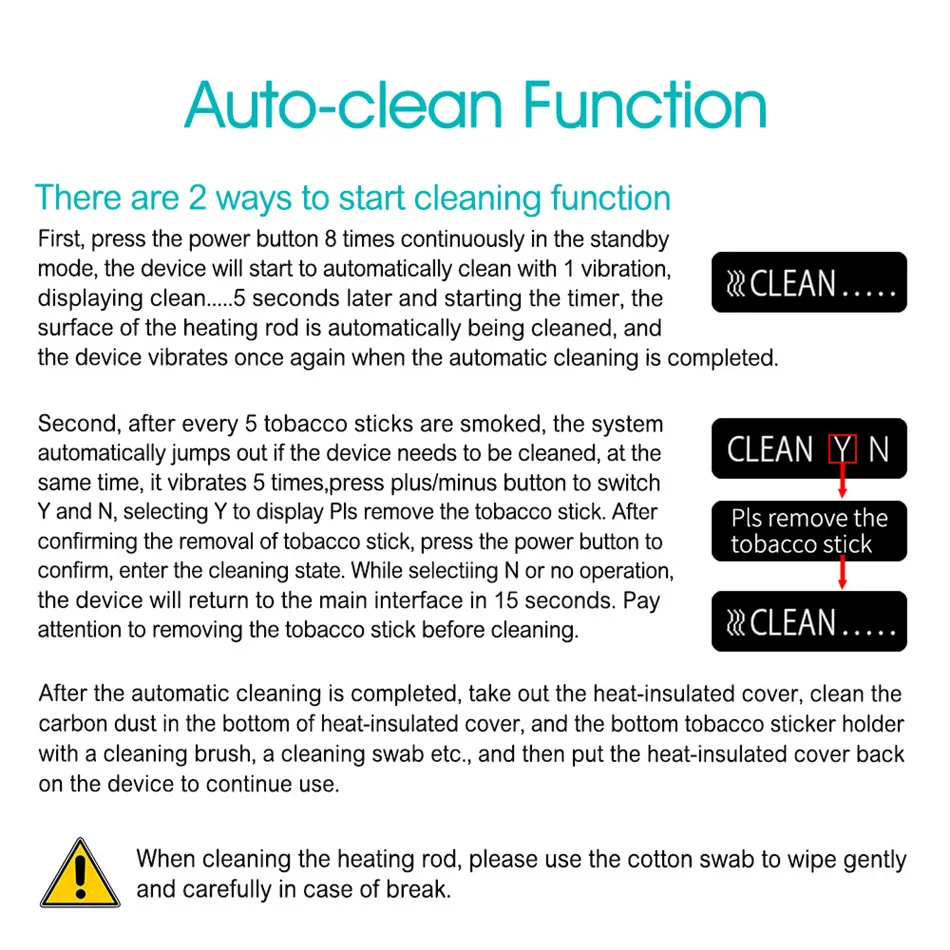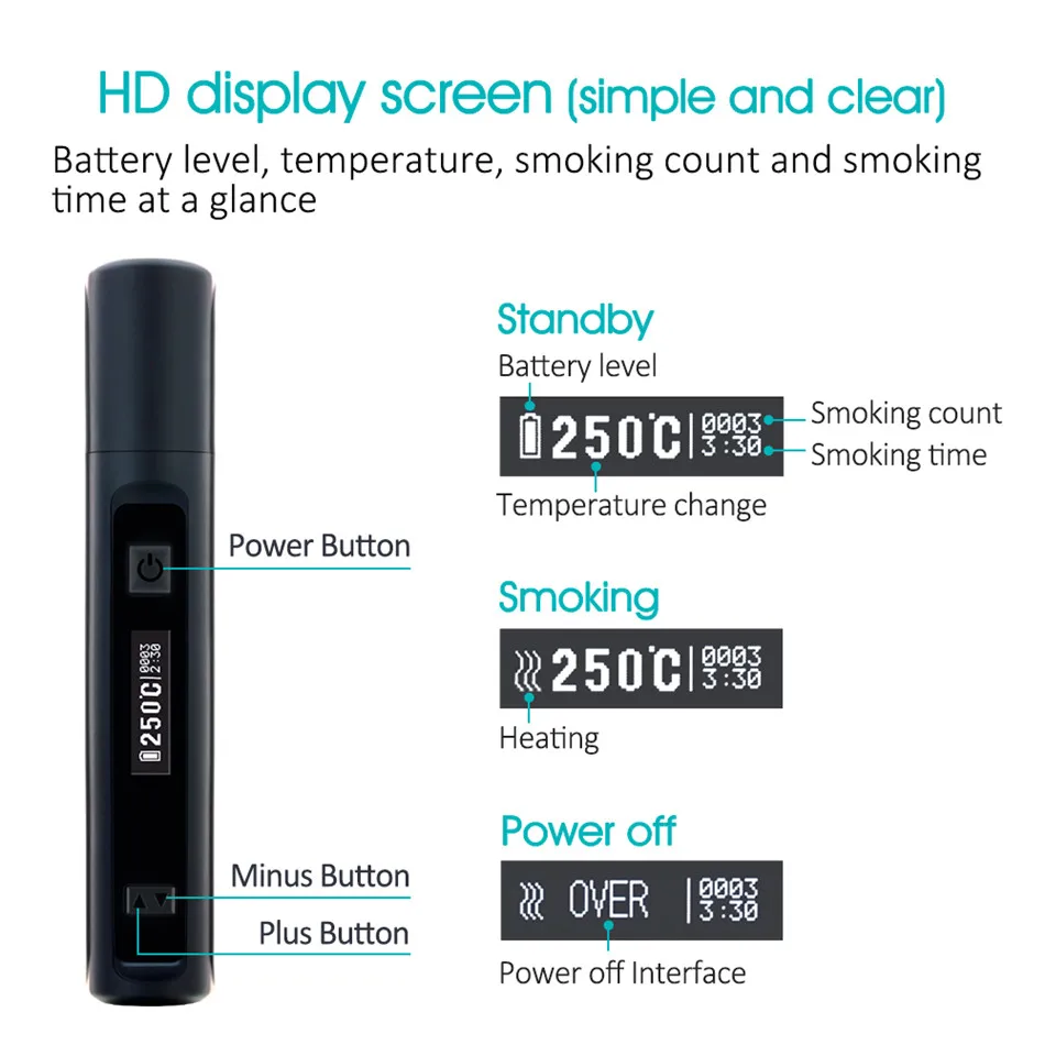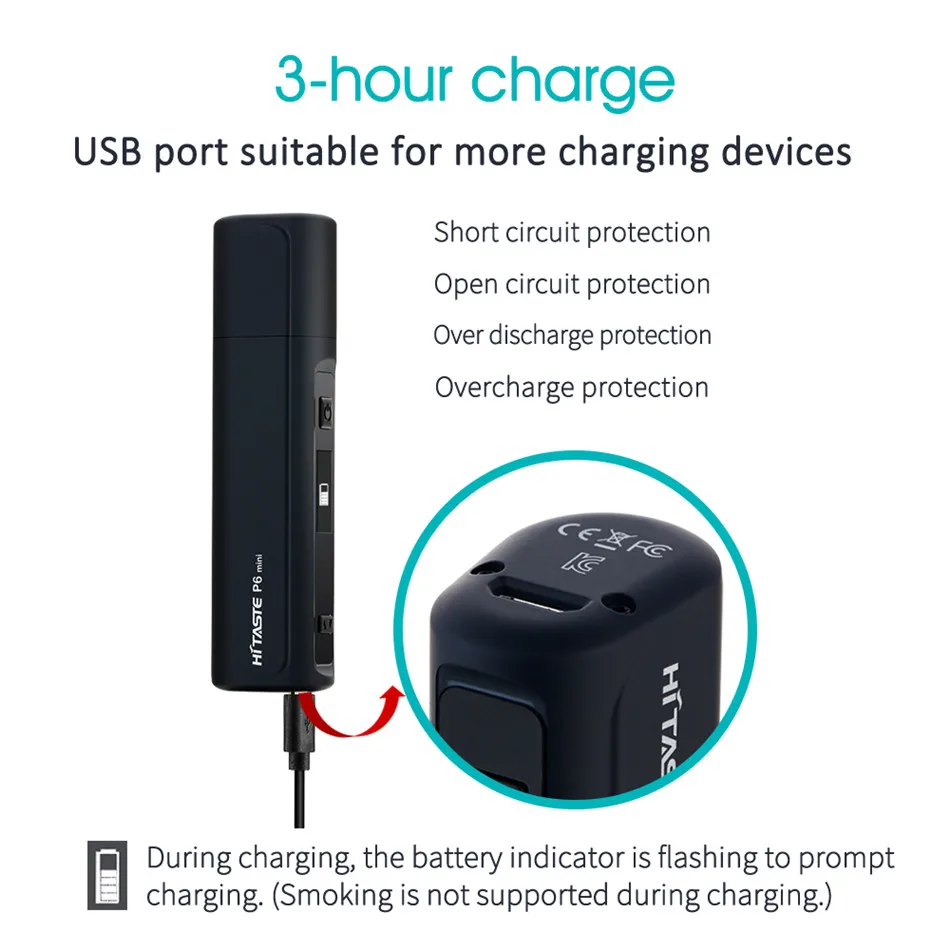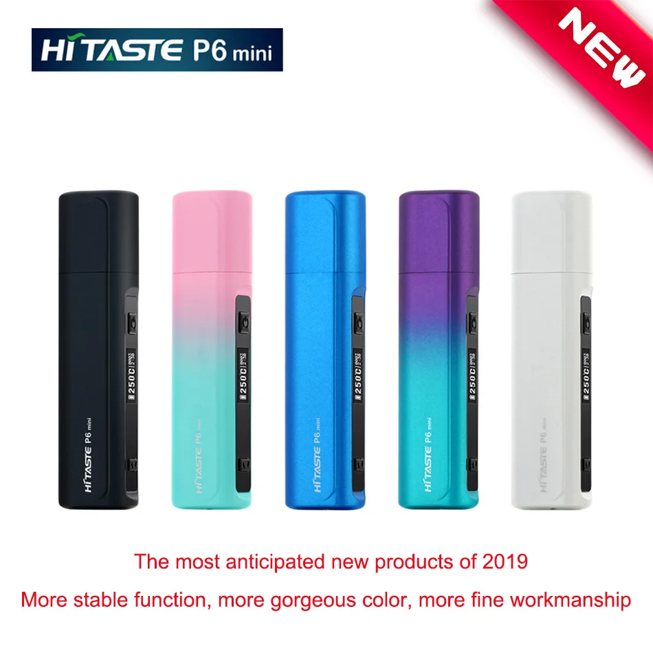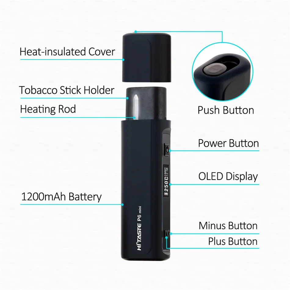 Hitaste P6mini est le premier appareil HNB au monde avec température et temps de fumage réglables, il est petit et facile à transporter, taille mini, s’adapte à n’importe quelle poche, prêt à en profiter. Built-in 1200 mAh, appui 15 pièces bâtonnets de tabac fumer temps 3 minutes. Goût comme une vraie cigarette pas de feu. Avoir un écran HD, présenter le niveau de la batterie, la température, le nombre de bâtons et le temps de fumer.Il a une fonction de nettoyage automatique. C’est un équipement de tabac sec très intelligent.