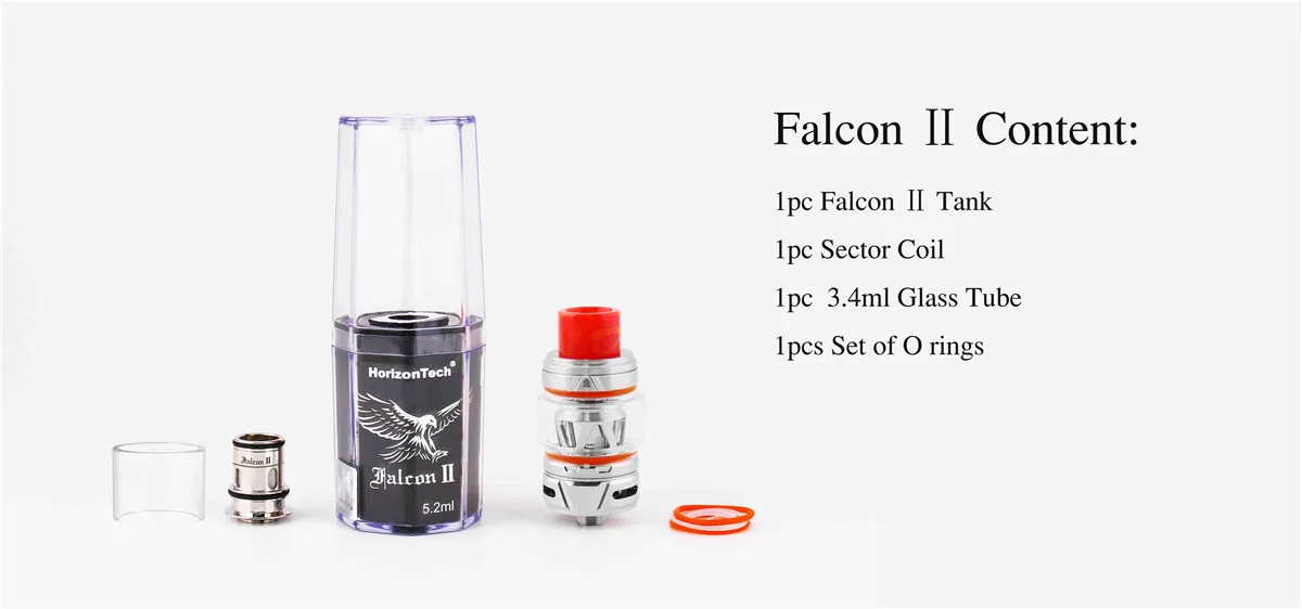 HorizonL’atomiseur de réservoir Falcon II Sub Ohm est une nouvelle version de la série HorizonTech Falcon, qui dispose d’une grande capacité de jus électronique de 5.5ml pour répondre à vos besoins de vapotage quotidiens. Le réservoir Horizon Falcon II adopte un verre Pyrex durable et un matériau en acier inoxydable de haute qualité, plus un embout goutte à goutte en résine, très beau. La conception de remplissage du réservoir Falcon II est très spéciale, cliquez sur le bouton pour ouvrir le capuchon supérieur.