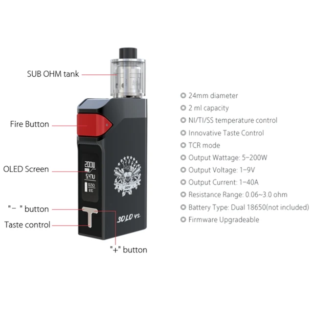 Ijoy – Cigarette électronique SOLO V2, Kit de démarrage 200W, Mod 200W, alimenté par une double batterie 18650, 2ml