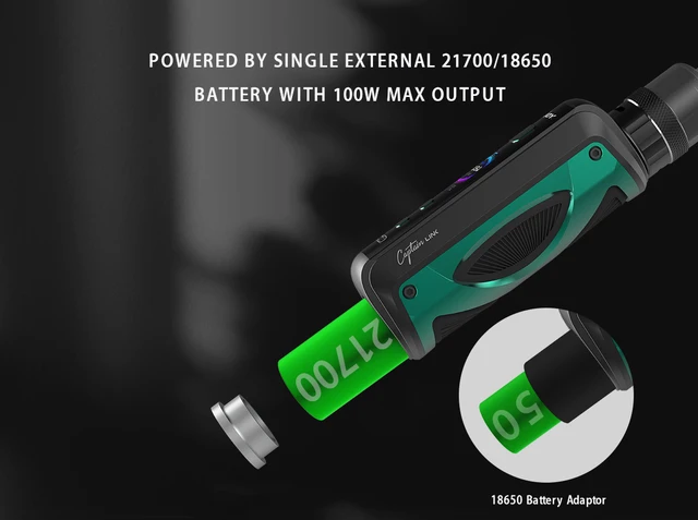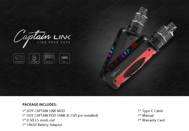 Captain Link Kit est un nouveau Kit Pod Mod de la série Captain. IJOY Captain Link Mod est alimenté par une seule batterie externe 21700/18650 avec une puissance maximale de 100W. Il offre également une expérience de vapotage puissante, intelligente et sûre avec le chipset Univ S 2.0 amélioré. IJOY Captain Link – Kit de dosettes avec écran TFT de 0.96 pouces et chargement rapide de Type C pour plus de commodité. Le réservoir Captain Pod a une grande capacité de 5ml de jus électronique, adopte un flux d’air inférieur à double fente. Il est compatible avec la bobine de maille de 0,5ohm L5 et la bobine de maille de clapton de 0,15ohm L15 pour apporter une super saveur et une durée de vie plus longue.
