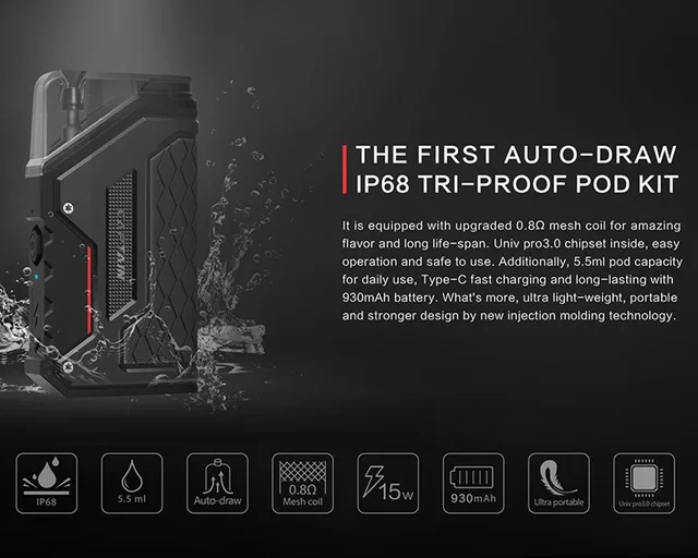 IJOY Captain AirGo est le premier kit de dosettes tri-proof IP68 de qualité militaire à tirage automatique, il est équipé d’une bobine de maille améliorée de 0,8 Ω pour une saveur incroyable et une longue durée de vie. Jeu de puces Univ pro3.0 à l’intérieur, opération facile et sûre à utiliser. De plus, grande capacité de dosette de 5.5ml pour une utilisation quotidienne, charge rapide de Type C et longue durée avec batterie de 930mAh. De plus, conception ultra portable et plus solide grâce à la nouvelle technologie de moulage par injection.
