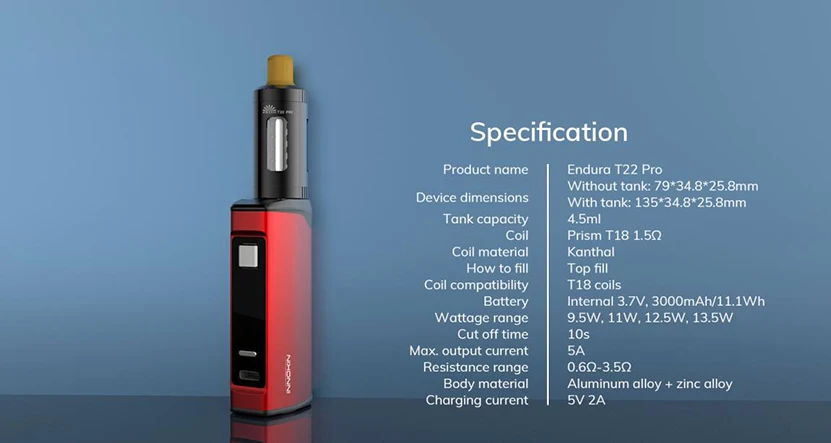 Endura T22 Pro Kit est le dernier produit de la série Endura. Il se compose d’une batterie Endura T22 et d’un réservoir T22 Pro de 4.5ml. La grande capacité de la batterie de 3000mAh est suffisante pour répondre au besoin de vapoter toute la journée. 4 niveaux de puissance réglables sont disponibles pour vous permettre de régler (9.5W/11W/12.5W/13.5W) avec la conception de puissance réglable. USB-C port de chargement apportera une recharge plus rapide et économiser votre temps. Vous pouvez remplir le réservoir en tournant simplement le capuchon supérieur. Endura T22 Pro Kit 4.5ml est compatible avec les bobines t18.