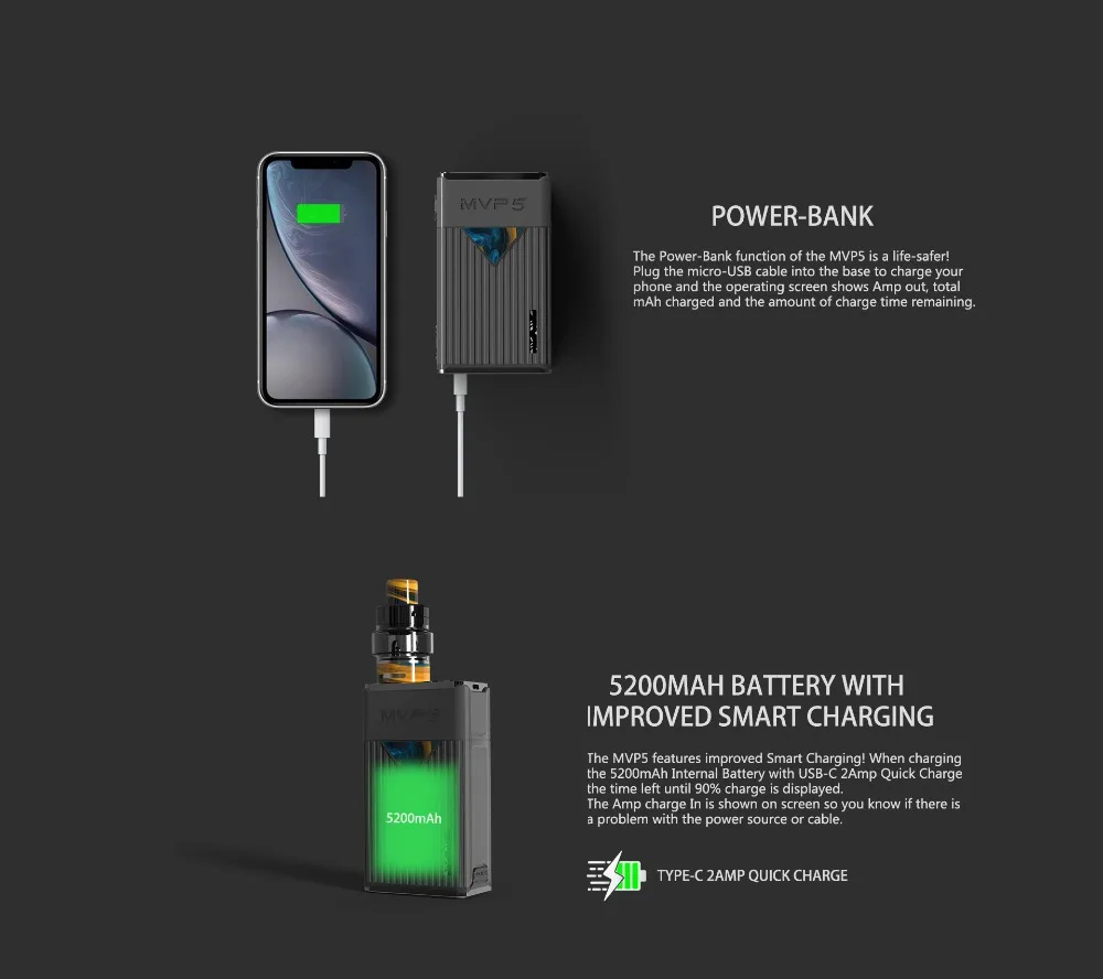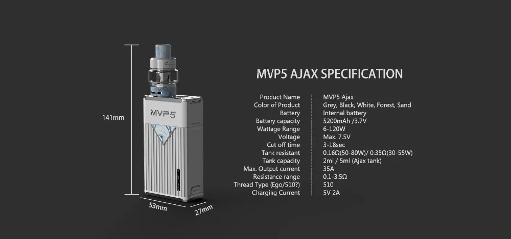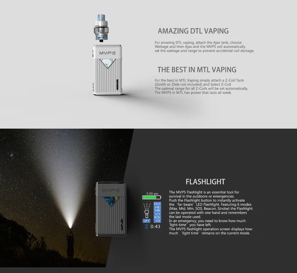 Le Kit MVP5 Ajax est composé de MVP5 Mod et Ajax Tank. C’est un kit de démarrage de vaporisateur compact MTL box avec batterie intégrée de 5200mAh et prend en charge une charge rapide de 2amp. Il est capable de tirer jusqu’à 235W de sortie max avec