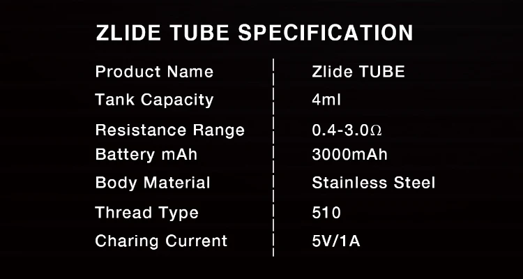 Zlide Tube Kit est un Kit de vaporisateur de style stylo, conçu pour être utilisé avec des bobines Z. Alimenté par une batterie interne de 3000mAh, charge intégrée de 1A, qui vous fera profiter d’une journée de vapotage. Ce kit est livré avec le nouveau réservoir Zlide de 24mm, 4ml, un capuchon supérieur de verrouillage de sécurité pour enfant et une section de réservoir en verre remplaçable par l’utilisateur et un joint en silicone, tout cela vous offrira une qualité et une saveur de vape exceptionnelles. Disponible en acier inoxydable, spirale, rose, bleu, camouflage de forêt, noir.