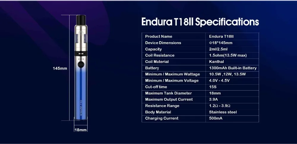 Endura T18 II Kit est célèbre comme une version améliorée du Kit Endura t18. Il présente un diamètre de 18mm et un filetage de 510. Et il se compose d’un réservoir T18 II de 2.5ml et d’une batterie intégrée de 1300mAh. Le réservoir adopte une conception de remplissage par le haut pratique et un contrôle réglable du flux d’air pour répondre à vos différents besoins de vaporisation. En outre, il est également compatible avec la bobine remplaçable T18/T22 (1,5 ohm), ce qui vous apportera une grande saveur et une super longévité. De plus, il utilise un capuchon magnétique hygiénique pour vous offrir une expérience de vapotage saine, propre et pratique.