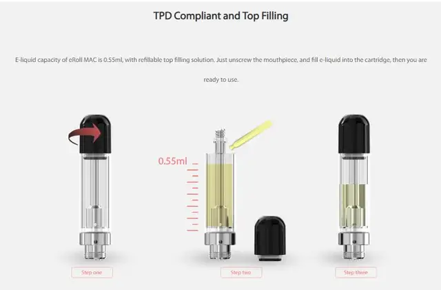 La cartouche eRoll MAC de Joyetech est spécialement conçue pour le Kit Simple eRoll MAC et le Kit avancé Joyetech eRoll Mac. Il est livré avec une capacité de 0.55ml d’e-jus. La bobine intégrée en céramique de 1.2ohm peut être utilisée avec le jus électronique de nic-sels. Il produira une saveur de vapotage lisse. Il suffit de l’obtenir pour votre Kit Joyetech eRoll MAC Simple. 5 pièces par paquet. Disponible en 3 coloris: noir, argent et rouge.