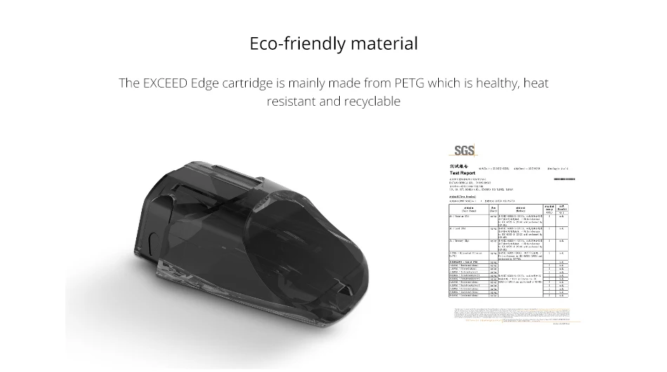 La cartouche EXCEED Edge est principalement fabriquée à partir de PETG qui est sain, résistant à la chaleur et recyclable.