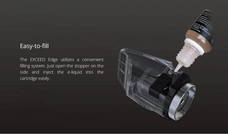 Le bord dépassé utilise un système de remplissage pratique. Il suffit d’ouvrir le bouchon sur le côté et d’injecter facilement le e-liquide dans la cartouche.