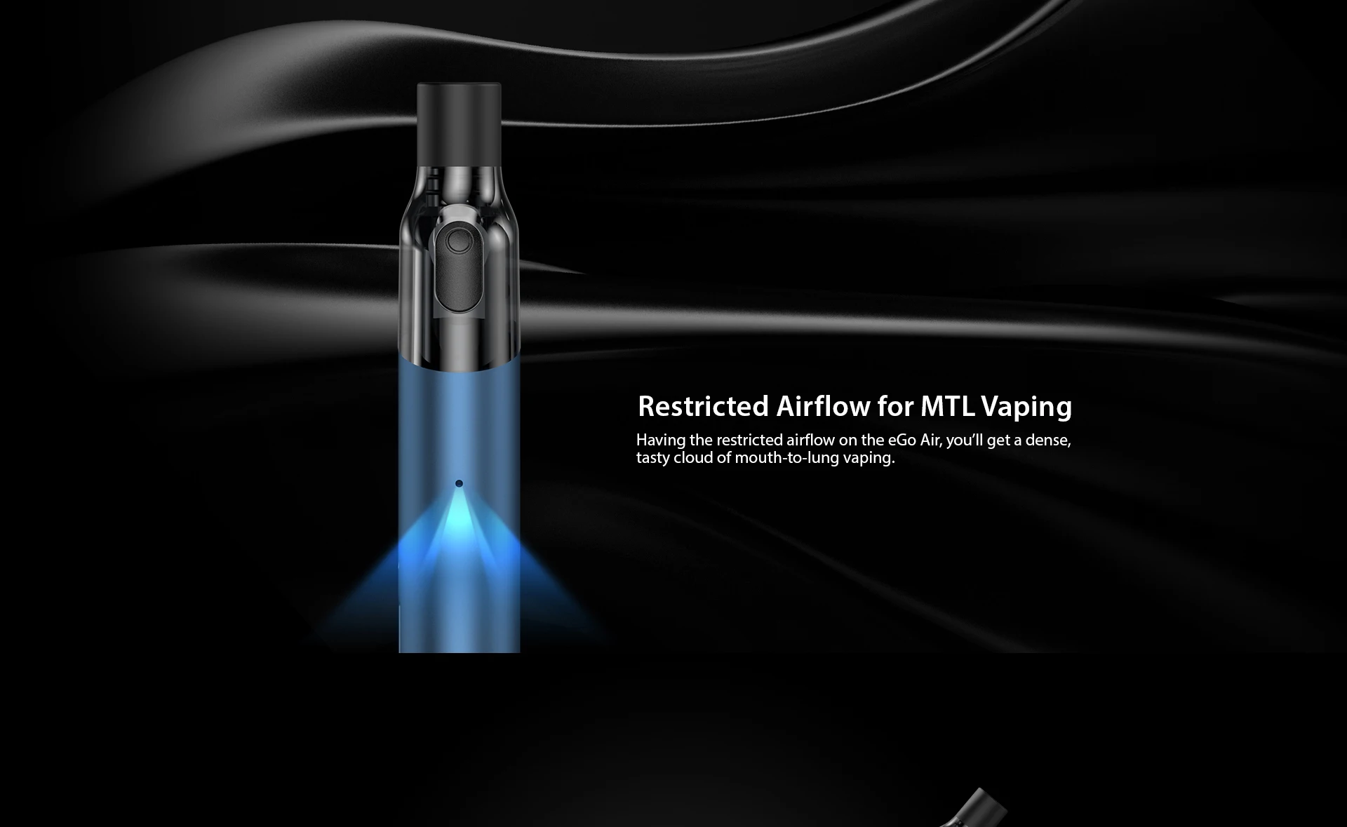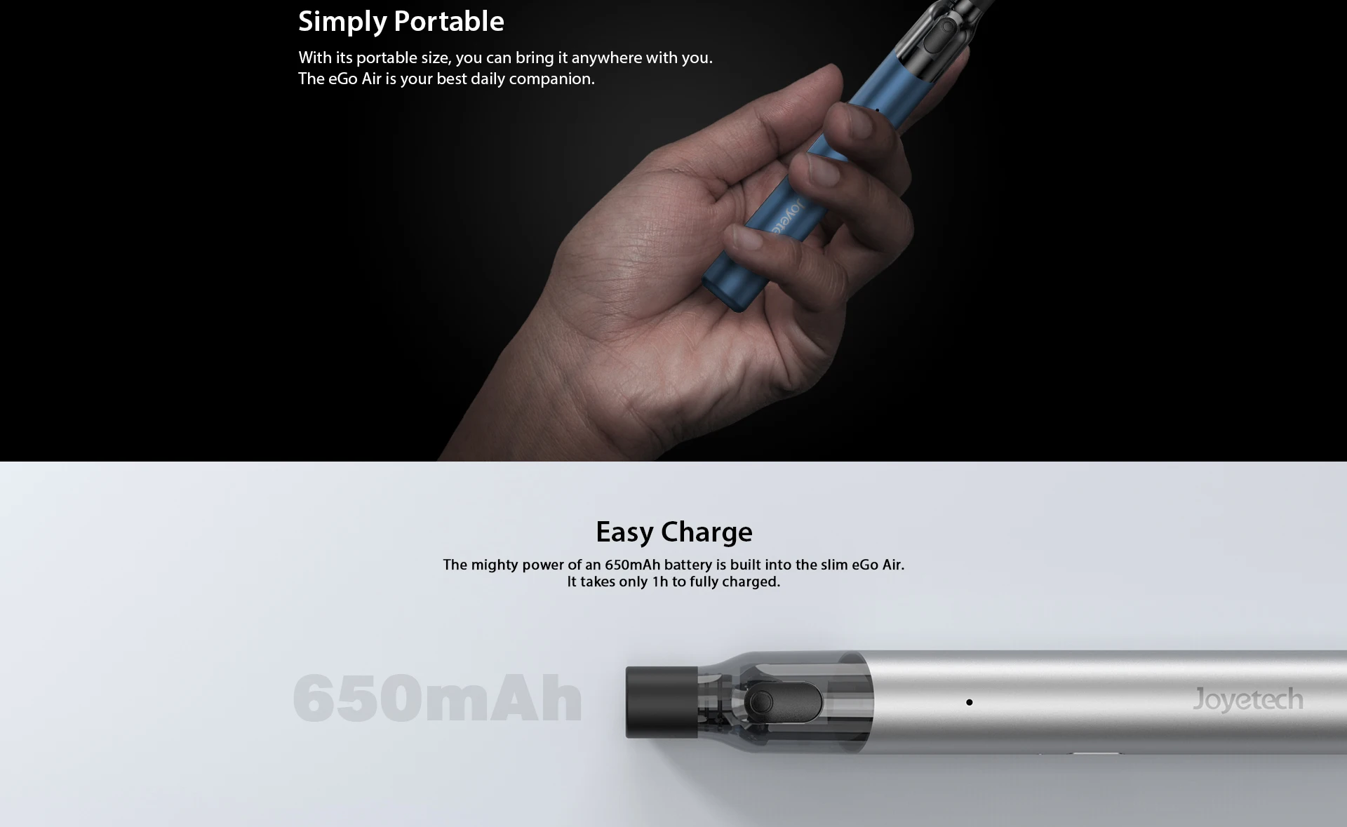EGo Air Kit est un kit de système de dosette simplement portable d’une capacité de 2ml de jus électronique. Il y a une bobine de maille à l’intérieur pour vous donner une saveur stimulante et un coup de gorge. Vous pouvez ouvrir la prise en silicone sur le côté pour recharger, ce qui est facile et étanche. Deux options sont disponibles pour vous: utilisation avec l’embout 510, utilisation avec le filtre sur le dessus. EGo Air présentera un flux d’air limité pour vous apporter une super vaporisation MTL. EGo Air Pod Kit est construit avec une batterie de 650mAh.