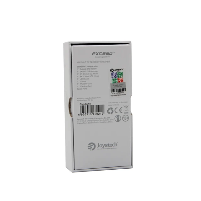 Le kit de démarrage Joyetech Exceed D19 comprend une batterie de capacité intégrée de 1500mah et un réservoir de 2ml. La batterie supérieure à D19 peut être commutée en mode de sortie directe et en mode de sortie à tension constante. Il peut supporter une puissance maximale de 40W. Il y a un indicateur LED supérieur pour indiquer le mode de vapotage et la batterie restante. La batterie dispose également de multiples protections. Le réservoir dépasse D19 est livré avec une conception de remplissage supérieur et un débit d’air inférieur réglable. Les nouvelles têtes de la série EX avec de grands trous e-liquide offriront un excellent goût de vapotage. Il peut contenir 2ml de liquide.