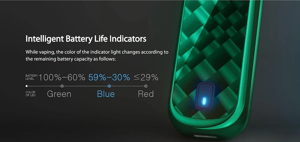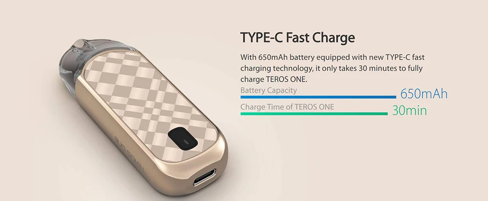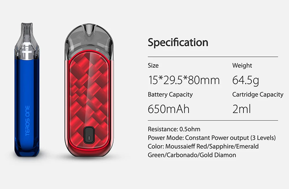 Teros One Kit de Joyetech est un kit de système de pod portable à la mode avec panneau en verre. C’est une version améliorée du Kit Teros. Il dispose d’une batterie intégrée de 650mAh. Il est livré avec une capacité de 2ml de jus électronique et une capacité de 2ml et une bouteille de recharge de jus électronique. Avec la technologie de charge rapide de type-c, il ne faut que 30 minutes pour être complètement chargé. Il existe trois niveaux de puissance: élevé, moyen et faible, qui peuvent répondre à vos différents besoins de vaporisation. Avec la bobine de maille de 0,5 ohm, il vous apportera une saveur de vaporisation lisse et pure. C’est un bon choix pour les amateurs de MTL. Il dispose d’un système de remplissage à l’épreuve des enfants, qui peut efficacement empêcher les fuites de liquide. Disponible en 5 couleurs: saphir, vert émeraude, Carbonado, diamant doré, rouge.