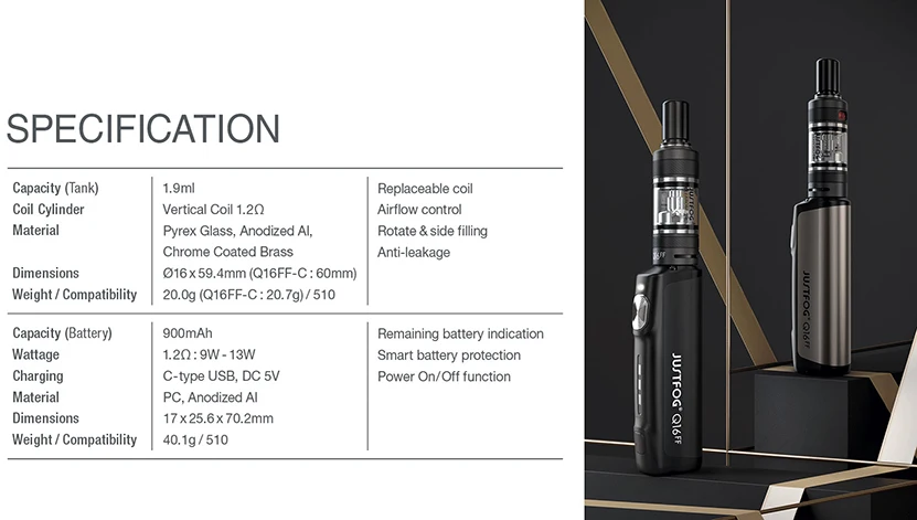 Le Kit Q16 FF est livré avec une capacité de batterie de 900mAh et un port de chargement USB type-c. Il est associé au réservoir Q16 FF, qui dispose d’un remplissage rotatif et latéral, conception anti-fuite. Q16FF est compatible avec la bobine FF (signifie saveur, focalisée), et la bobine FF est conçue pour apporter l’expérience de saveur la plus exceptionnelle. Il y a un bouton de contrôle de la puissance pour vous permettre de sélectionner la meilleure puissance: 9W, 11W ou 13W. De plus, vous pouvez profiter de la fonction de puissance constante avec le Kit Q16 FF. Le réservoir Q16 FF a une capacité de 1.9ml.