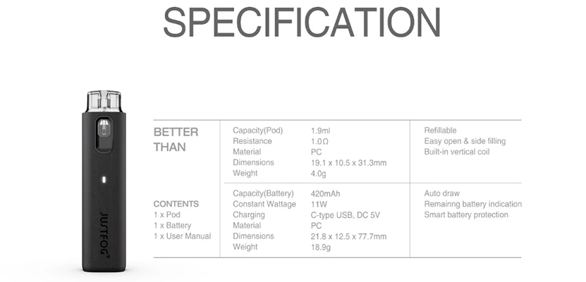 Justfog – stylo de vapotage Original, meilleur que le Kit, batterie 420mAh 11W, cartouche de dosette 1.9ML, bobine verticale, vaporisateur de cigarettes électroniques