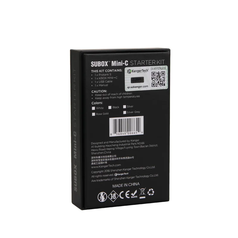 Le kit de démarrage Kanger Subox mini-c comprend un protancan 5 qui a une capacité de 3ml de jus électronique et un mod KBOX mini-c alimenté par une seule batterie 18650. Le protancan 5 présente une conception de remplissage par le haut et une conception étanche. Il peut être utilisé avec la bobine SSOCC. Le mod KBOX mini-c supporte une sortie variable de 7W-50W. Trois couleurs peuvent être choisies.