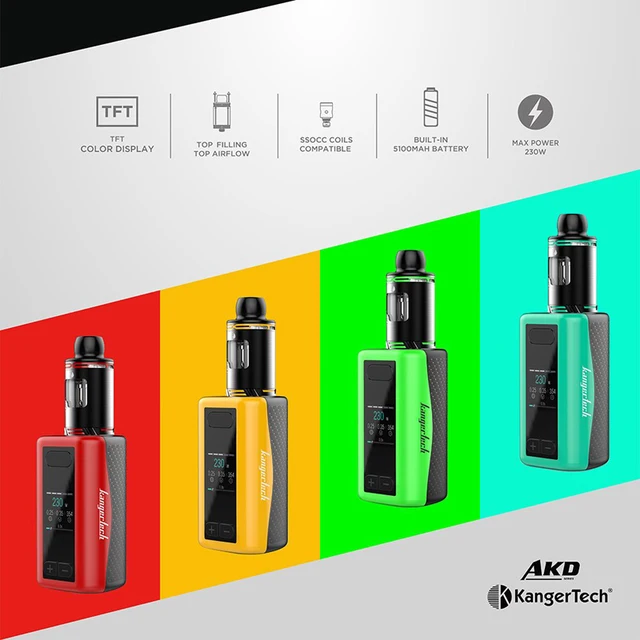 KangerTech – Kit de démarrage AKD 230W, avec écran couleur IKEN, 5100mAh, réservoir d’atomiseur 4ml, bobine SSOCC SS 0.2 ohm-jaune