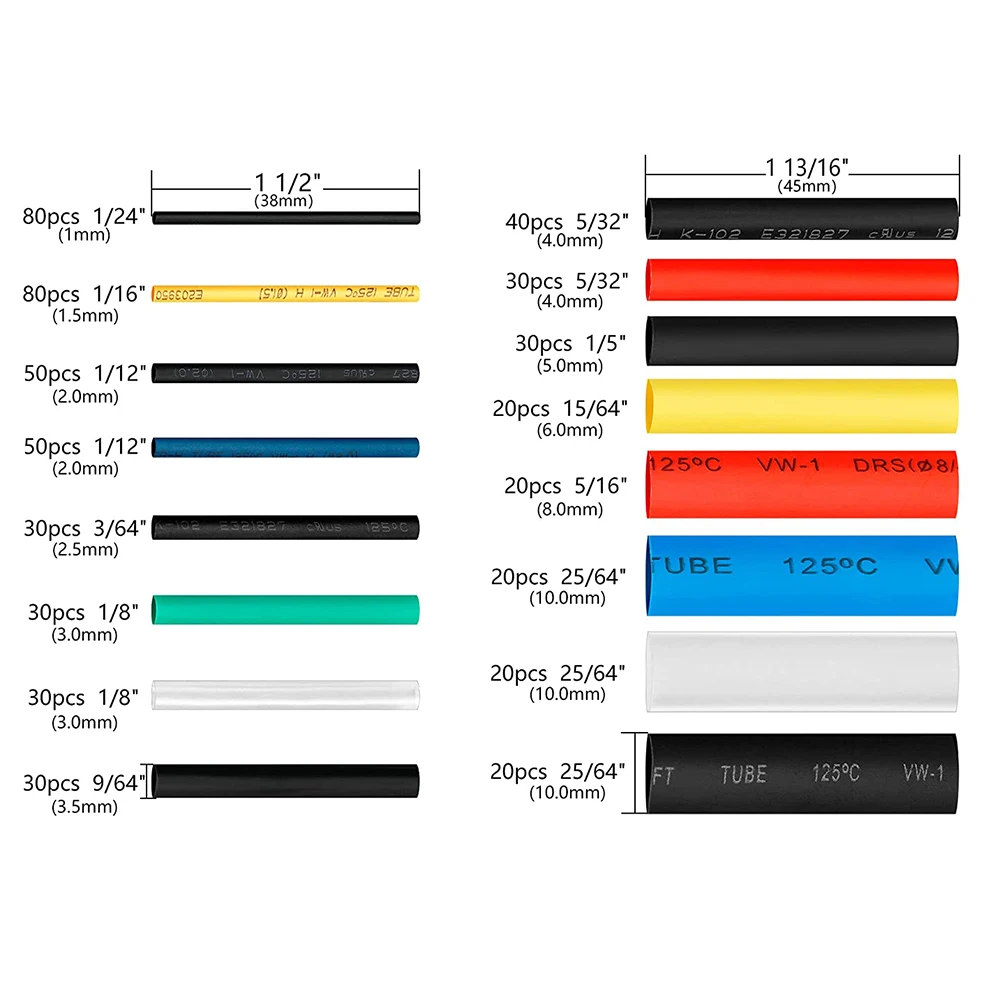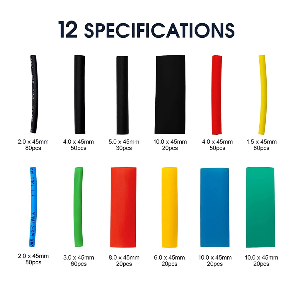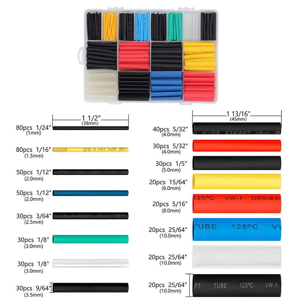 Le paquet incluent: 530 thermorétractable tubes avec 6 couleurs et 12 des tailles qui s’adaptent à tous les types de fils et câbles, tous emballés dans une boîte en plastique pour un rangement facile ou transporter.