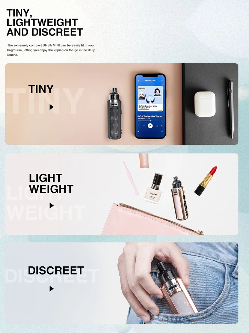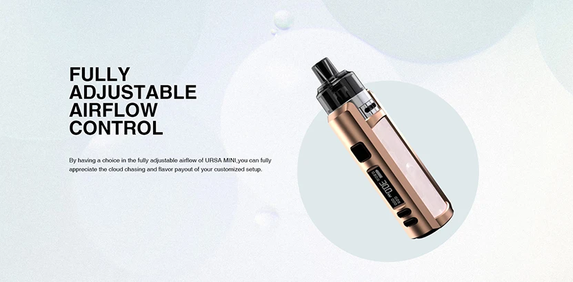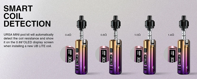 Ursa Mini Kit se distingue des dispositifs de vape avec les principales caractéristiques dont vous avez besoin. Tout d’abord, il est minuscule, extrêmement compact, léger et discret pour que vous puissiez le transporter facilement et commodément. Deuxièmement, le Mini Kit Ursa dispose d’une batterie intégrée de 1200mAh avec une puissance de sortie de 5-30W, vous pouvez profiter d’une vaporisation d’une journée complète et trouver votre puissance idéale et obtenir la saveur parfaite. La conception de charge de type c rend la charge rapide. Troisièmement, le Mini Kit Ursa est équipé d’une ventouse magnétique de 3ml avec un système de remplissage par le bas simple. Il prend également en charge le contrôle du flux d’air à réglage complet pour apporter une expérience de vapotage différente. De plus, Ursa Mini est compatible avec les bobines UB Lite, dispose d’une détection intelligente des bobines. Il suffit de prendre le Mini Kit Ursa pour découvrir une saveur et une satisfaction incroyables!